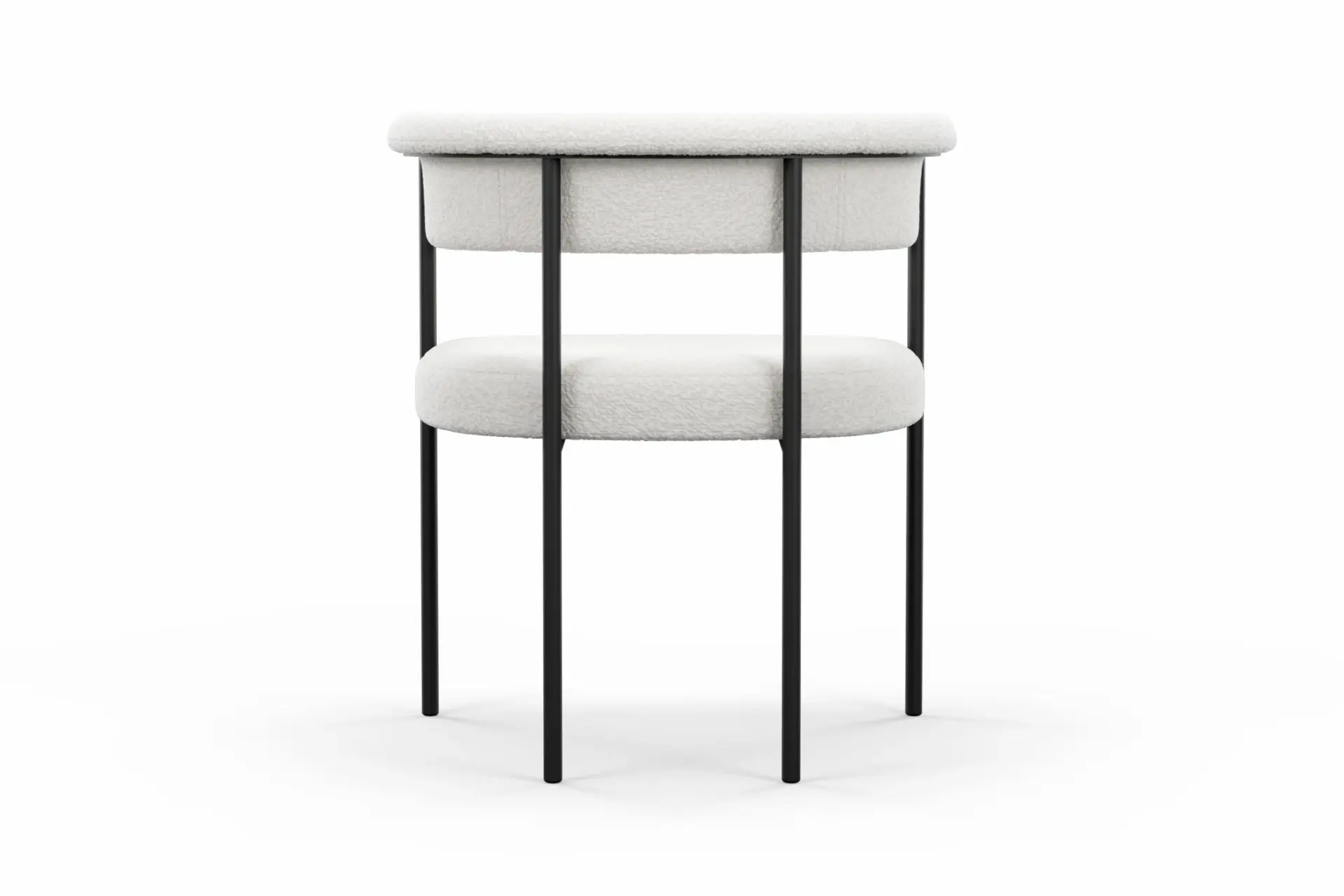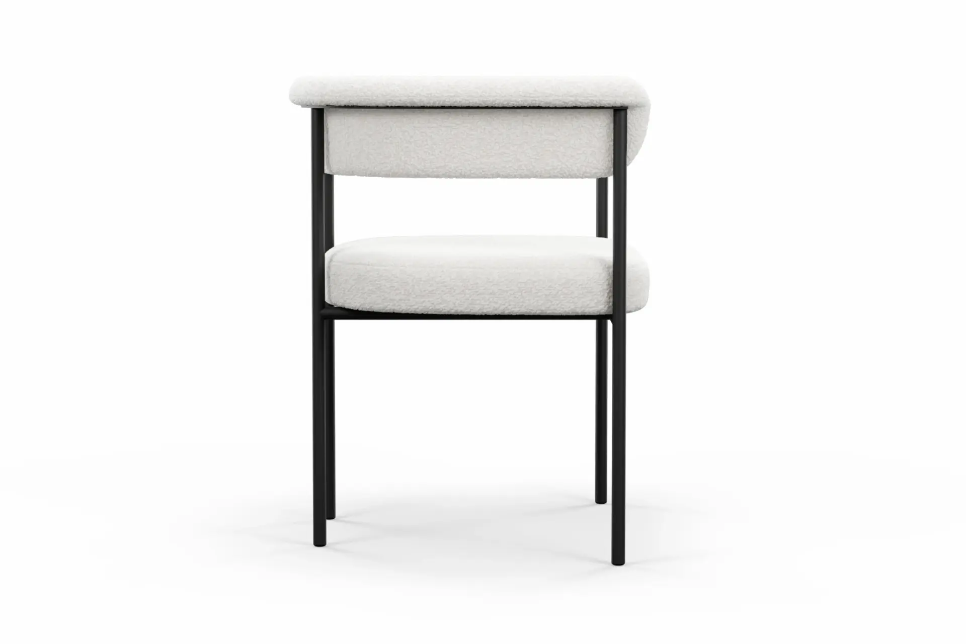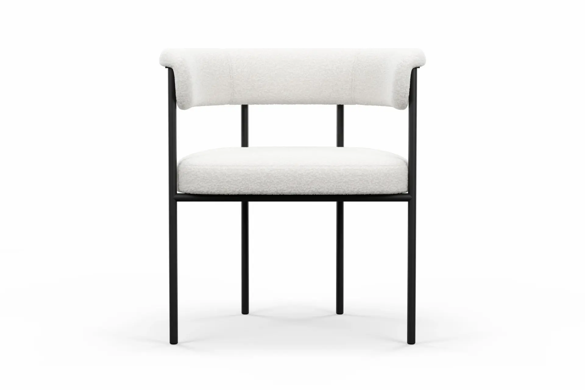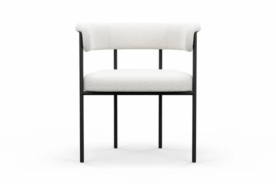 With its harmonious blend of modern structure and inviting texture, this dining chair brings a refined yet approachable presence to the table. Upholstered in plush bouclé, it offers a soft, tactile experience that contrasts beautifully with the clean precision of its black metal frame. The gently curved backrest and generously cushioned seat provide supportive comfort, encouraging relaxed, unhurried dining. Its slim, architectural legs lend a sense of lightness while ensuring lasting stability, creating a balanced silhouette that feels both contemporary and timeless. Designed to complement a range of interiors, from minimalist to more expressive spaces, this chair delivers understated elegance with everyday practicality. -