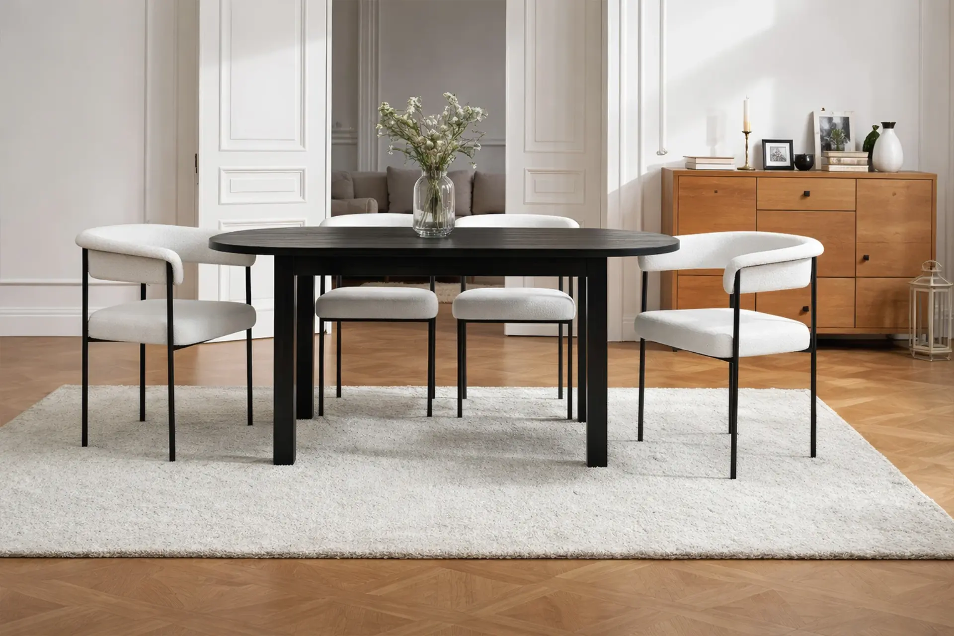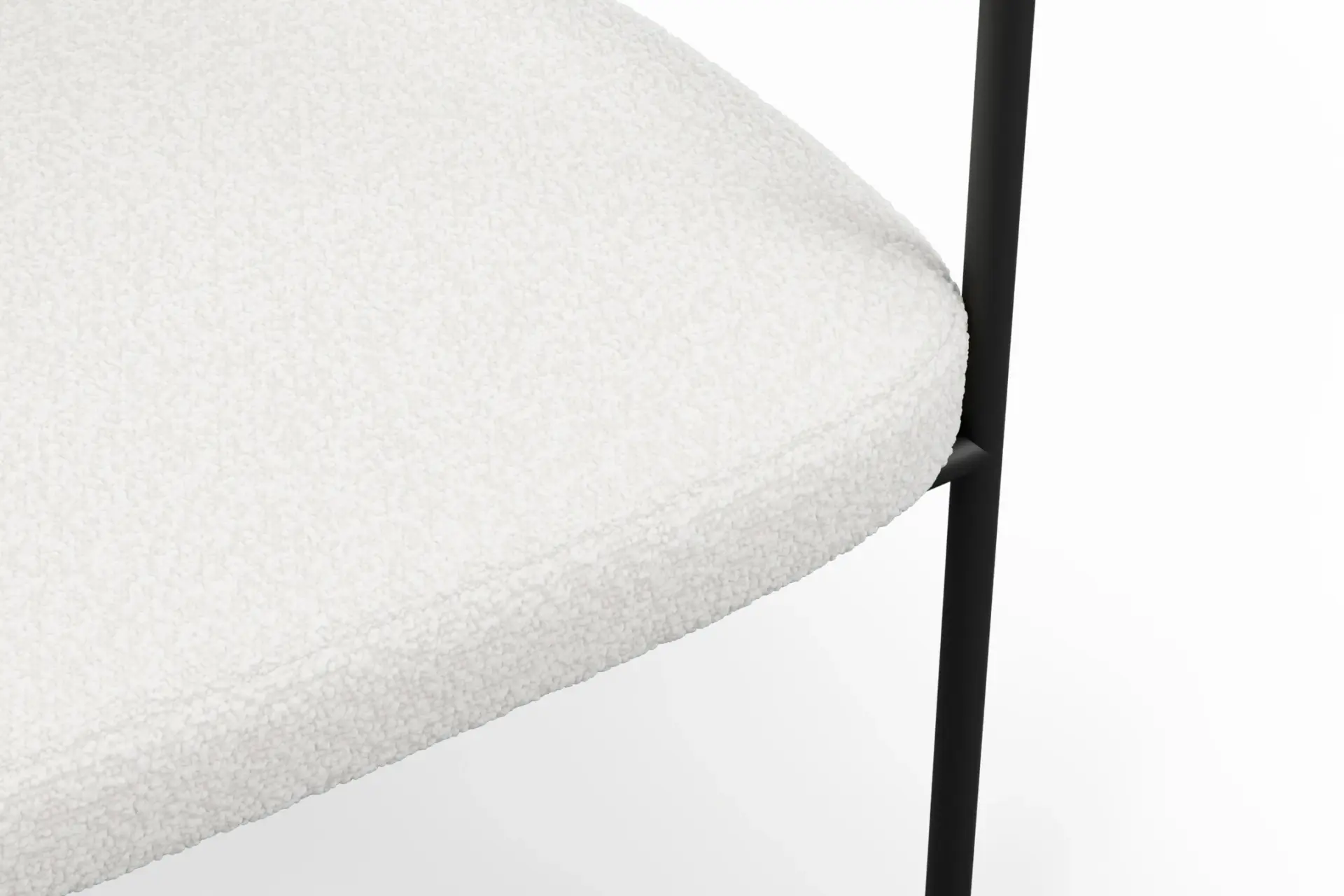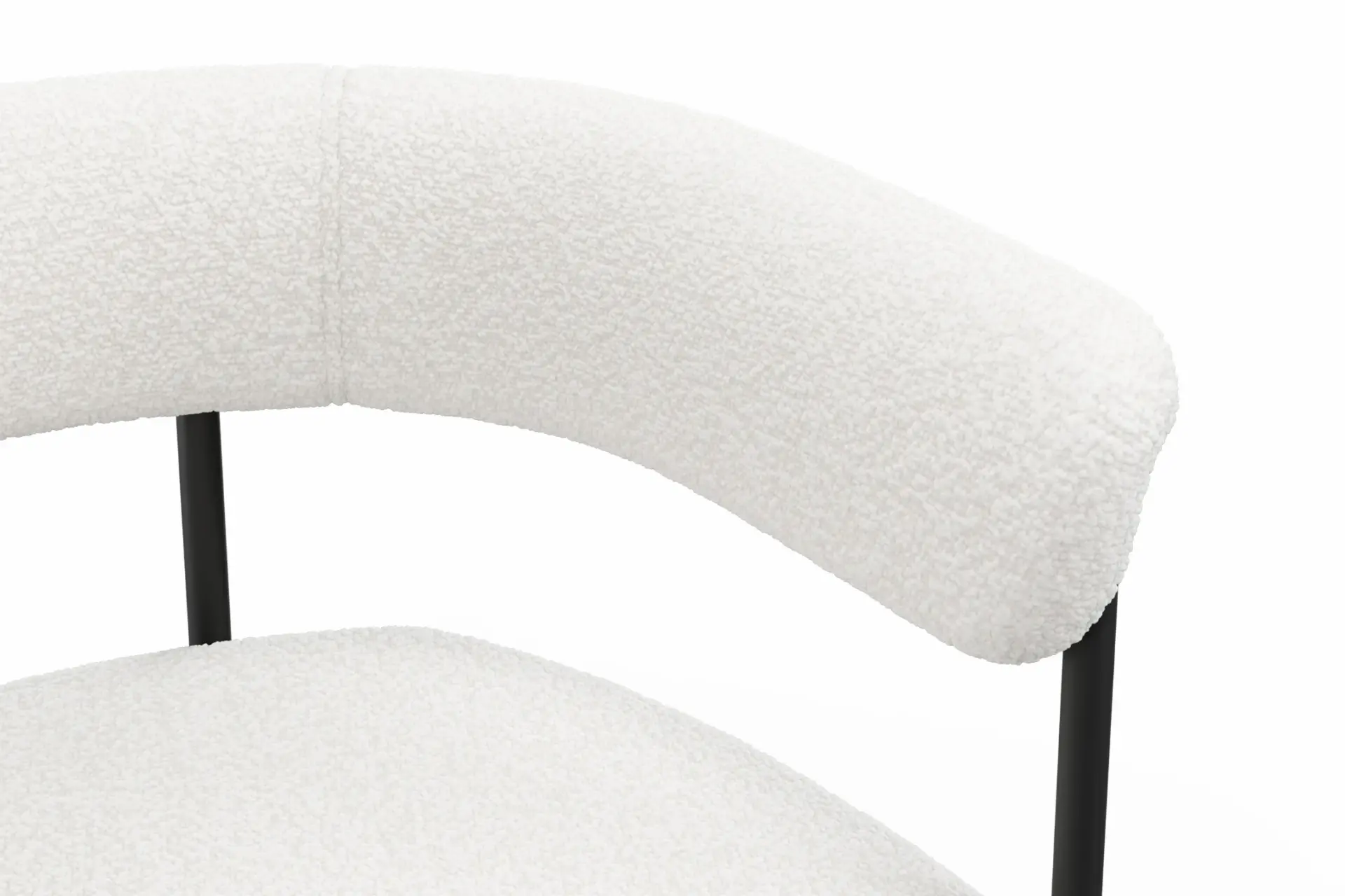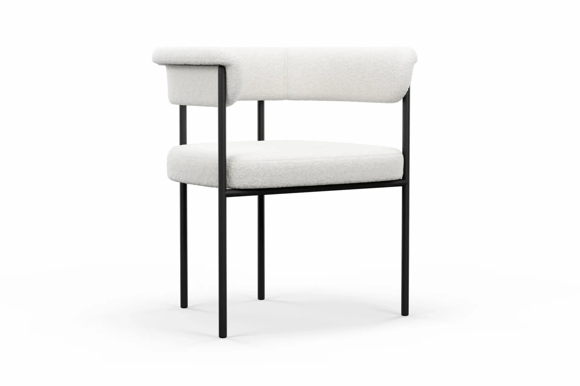 With its harmonious blend of modern structure and inviting texture, this dining chair brings a refined yet approachable presence to the table. Upholstered in plush bouclé, it offers a soft, tactile experience that contrasts beautifully with the clean precision of its black metal frame. The gently curved backrest and generously cushioned seat provide supportive comfort, encouraging relaxed, unhurried dining. Its slim, architectural legs lend a sense of lightness while ensuring lasting stability, creating a balanced silhouette that feels both contemporary and timeless. Designed to complement a range of interiors, from minimalist to more expressive spaces, this chair delivers understated elegance with everyday practicality. -