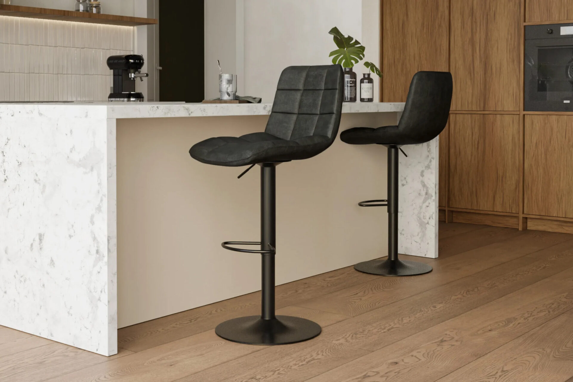 Sleek black vegan leather paired with a matching black base, this bar stool brings Scandinavian minimalism and strength. Compact, versatile, and durable, it supports up to 150 kg while fitting perfectly into kitchens, home bars, or offices.