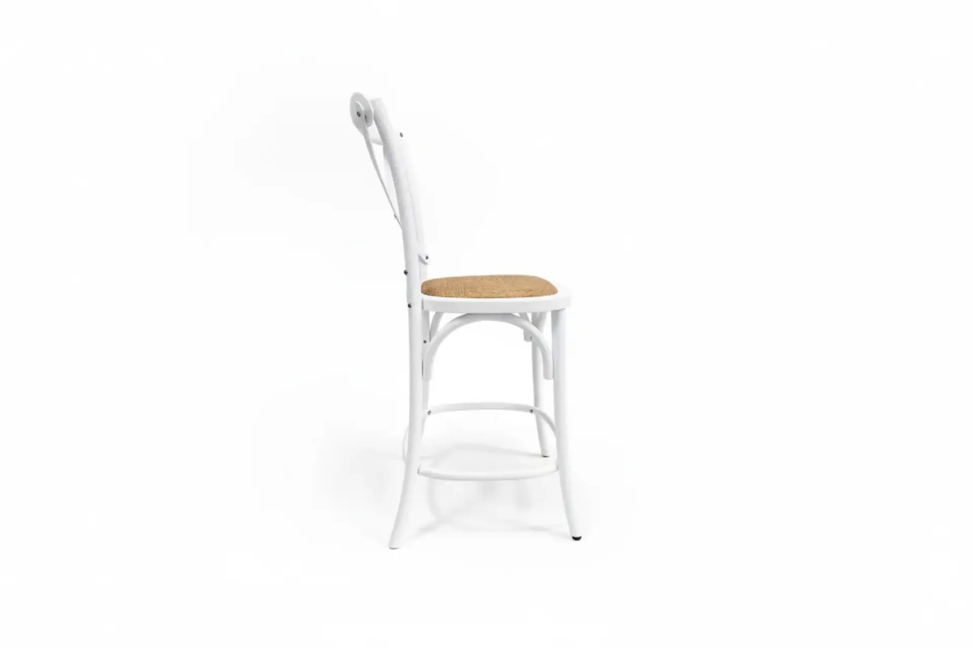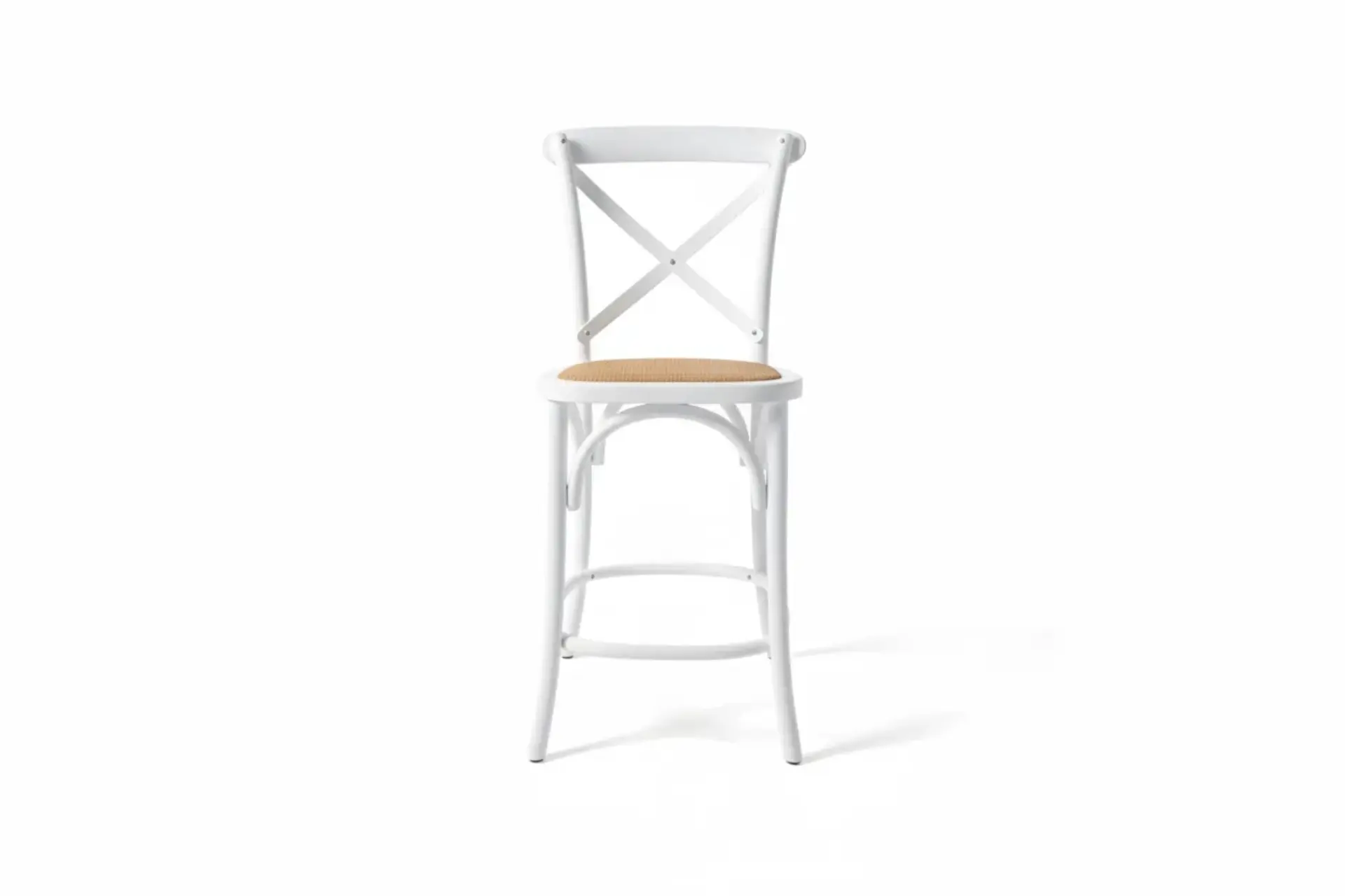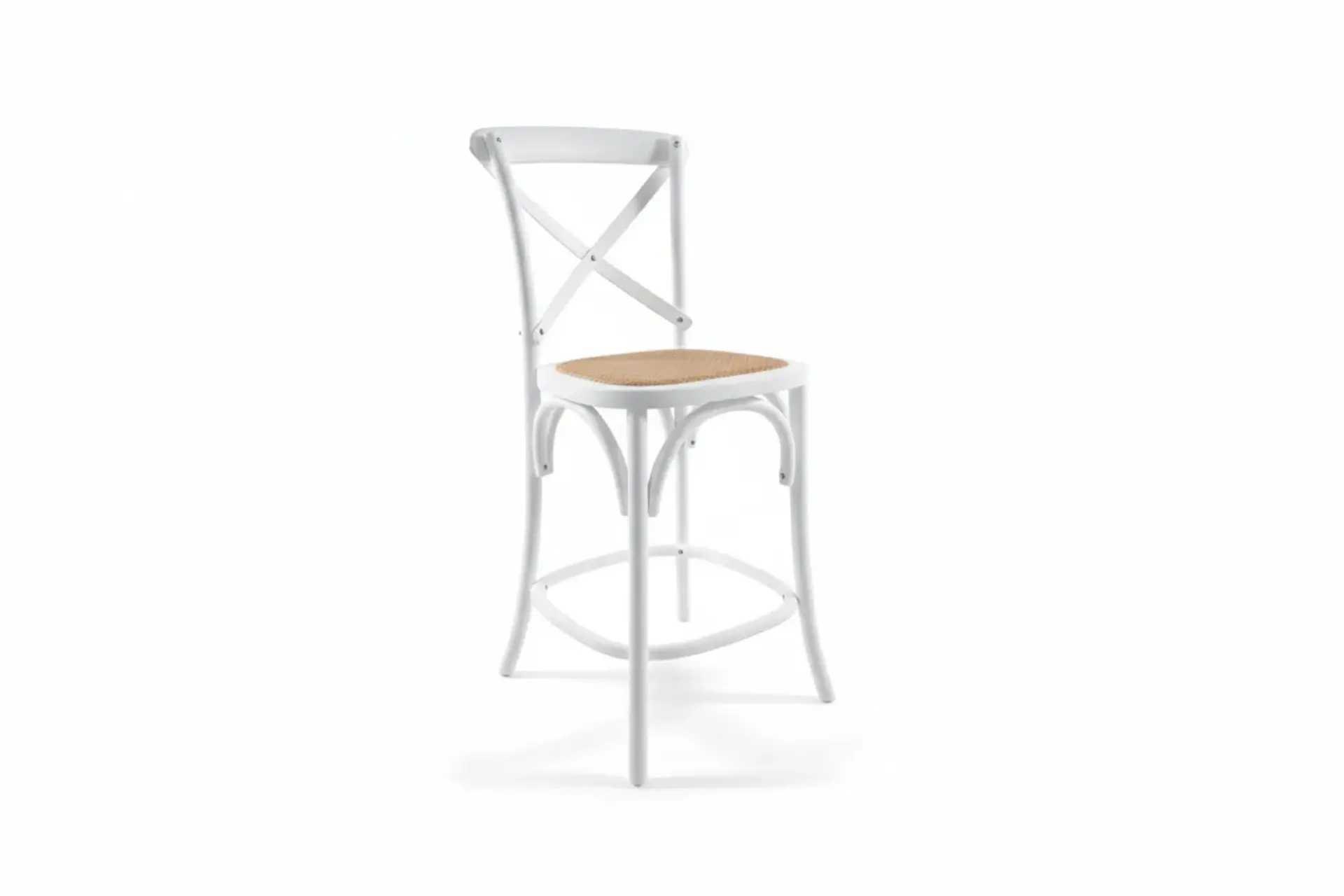 The Crossback Barstool in White features a convenient stackable design, allowing for easy storage and flexibility. With its natural rattan seat and crisp finish, it brings light, charm, and versatility to any interior—combining French-inspired beauty with modern practicality.