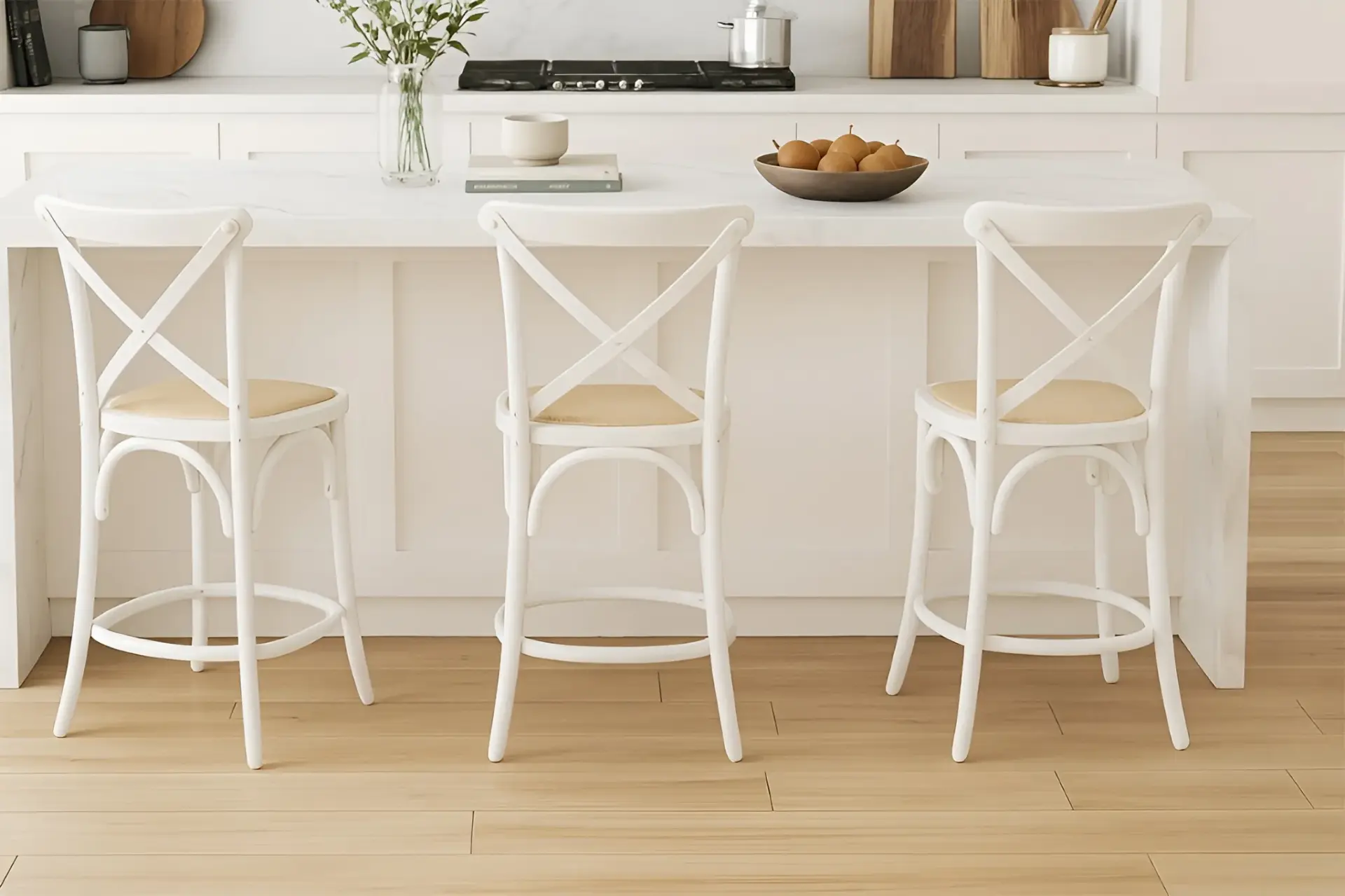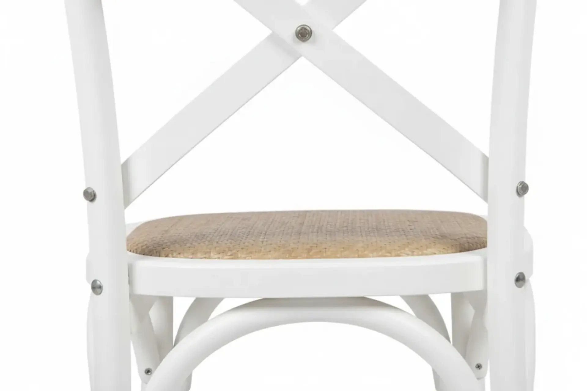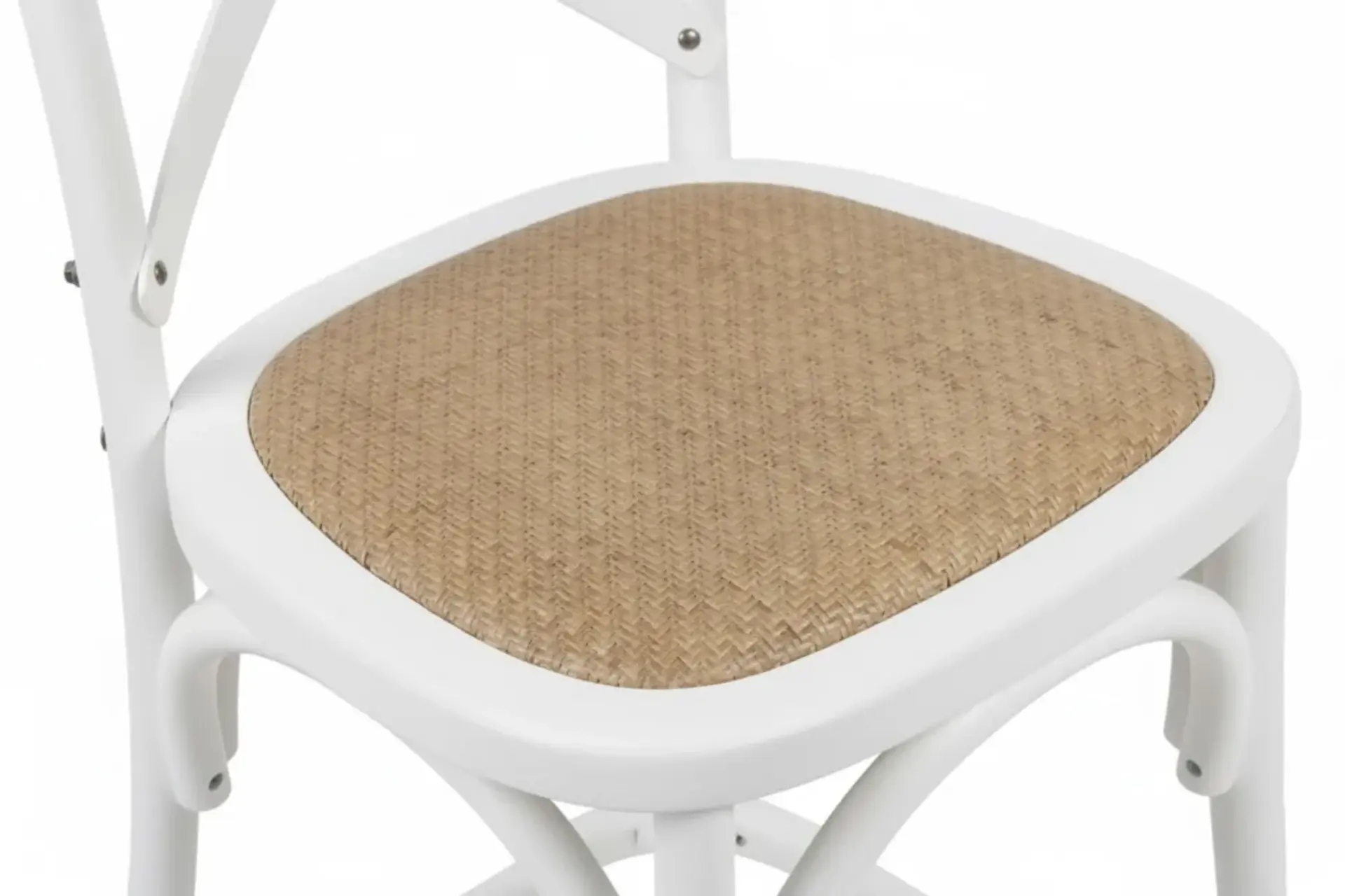 The Crossback Barstool in White features a convenient stackable design, allowing for easy storage and flexibility. With its natural rattan seat and crisp finish, it brings light, charm, and versatility to any interior—combining French-inspired beauty with modern practicality.