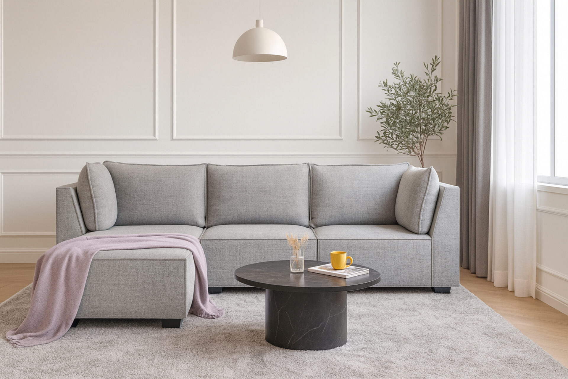 The Elaine Four Seater Sectional in Light Grey Linen combines Nordic minimalism with generous comfort. Spacious and versatile, it’s ideal for family gatherings or quiet evenings—turning any living space into a refined retreat filled with timeless style, warmth, and everyday wellbeing.