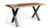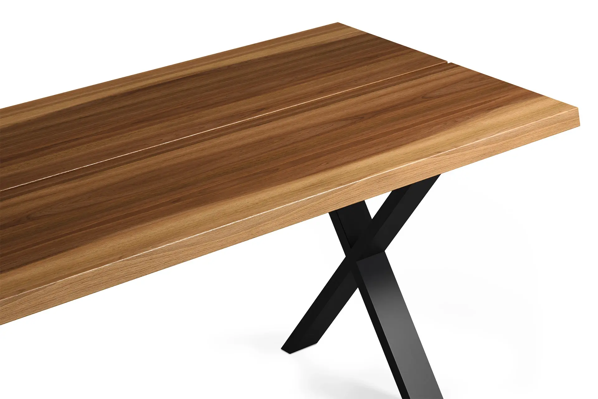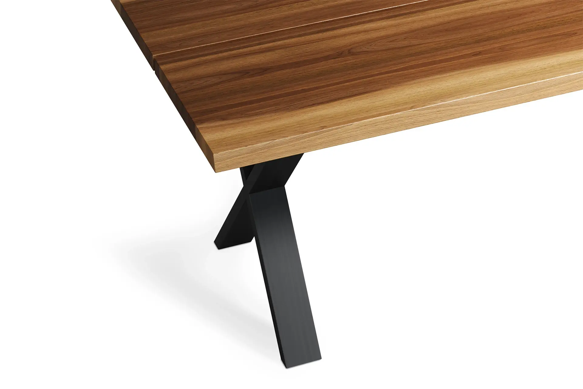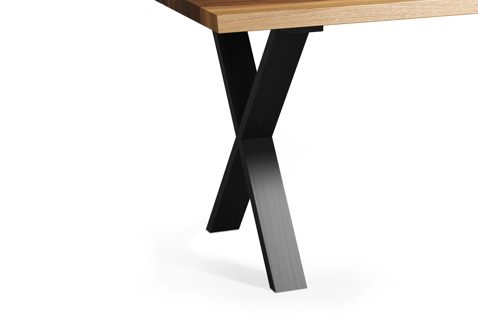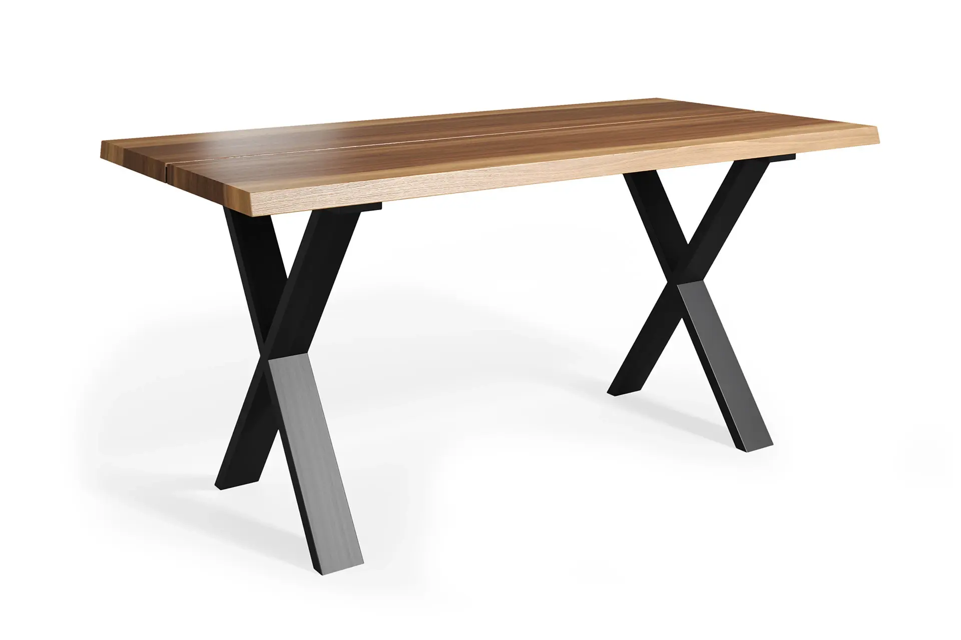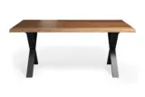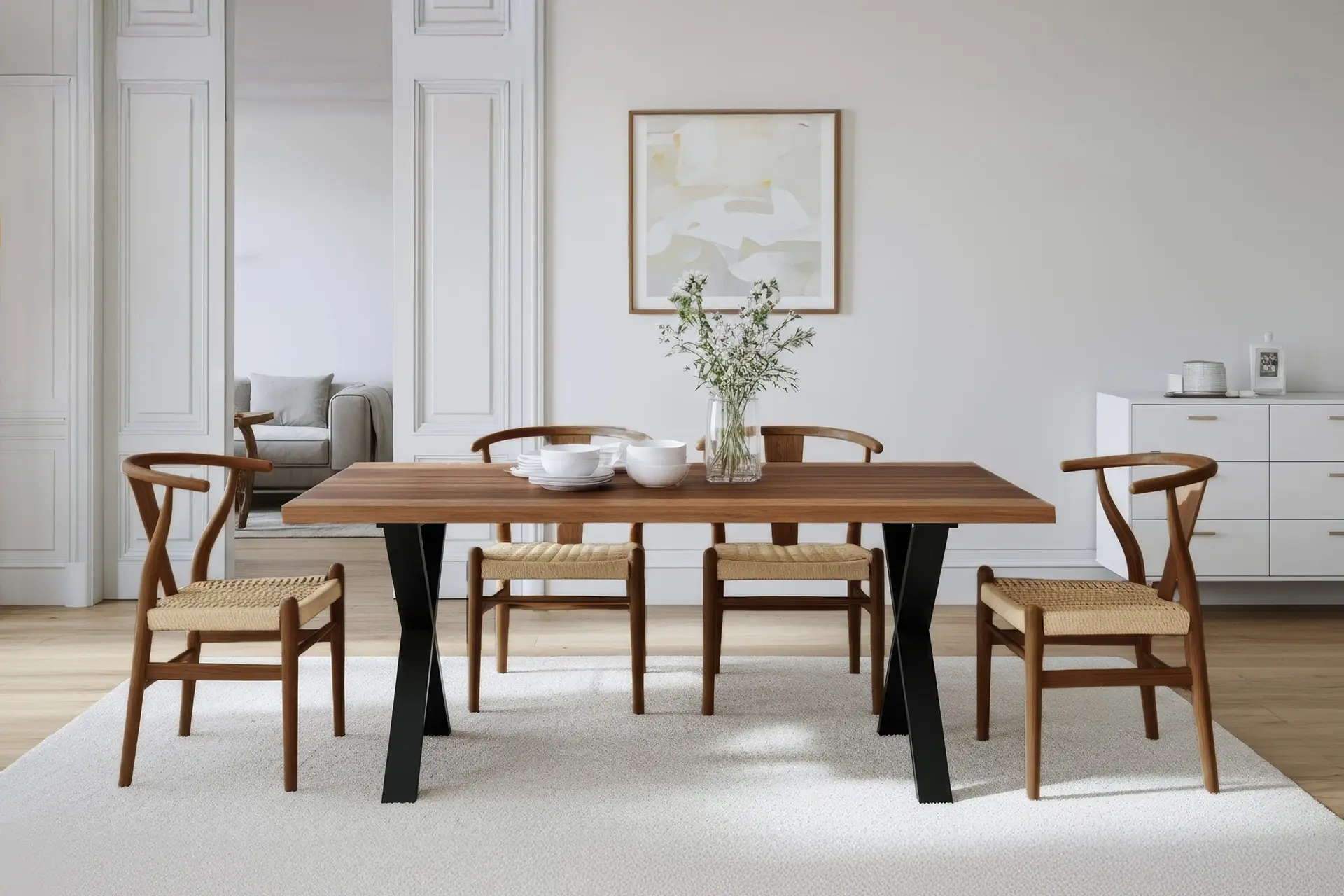 Bring refined simplicity and modern craftsmanship into your dining space with this striking table. Featuring a beautifully finished wooden tabletop with natural grain patterns, it delivers warmth and character while maintaining a clean, contemporary look. The bold, sculptural black legs create a strong visual contrast and provide exceptional stability, making it as durable as it is stylish. Perfect for everyday meals or hosting guests, this table blends timeless materials with modern design to elevate any interior. -