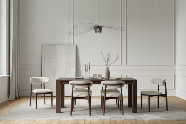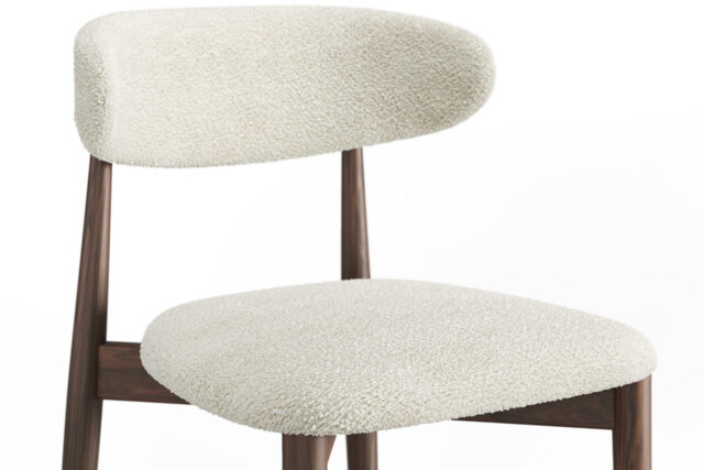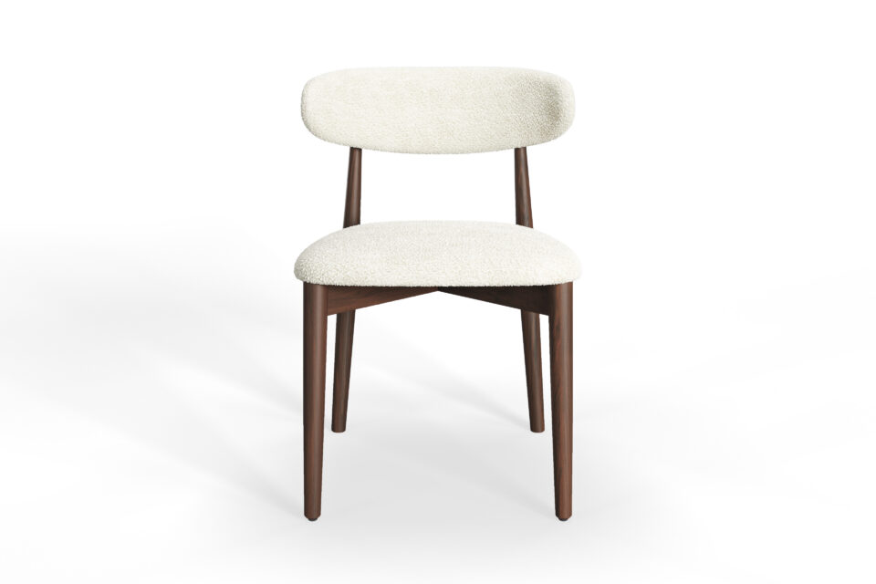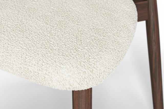 Walnut's bold richness meets the crisp purity of white boucle, shaping a chair that feels dramatic yet inviting. Perfect for those who love dining spaces with atmosphere, contrast, and timeless allure.
