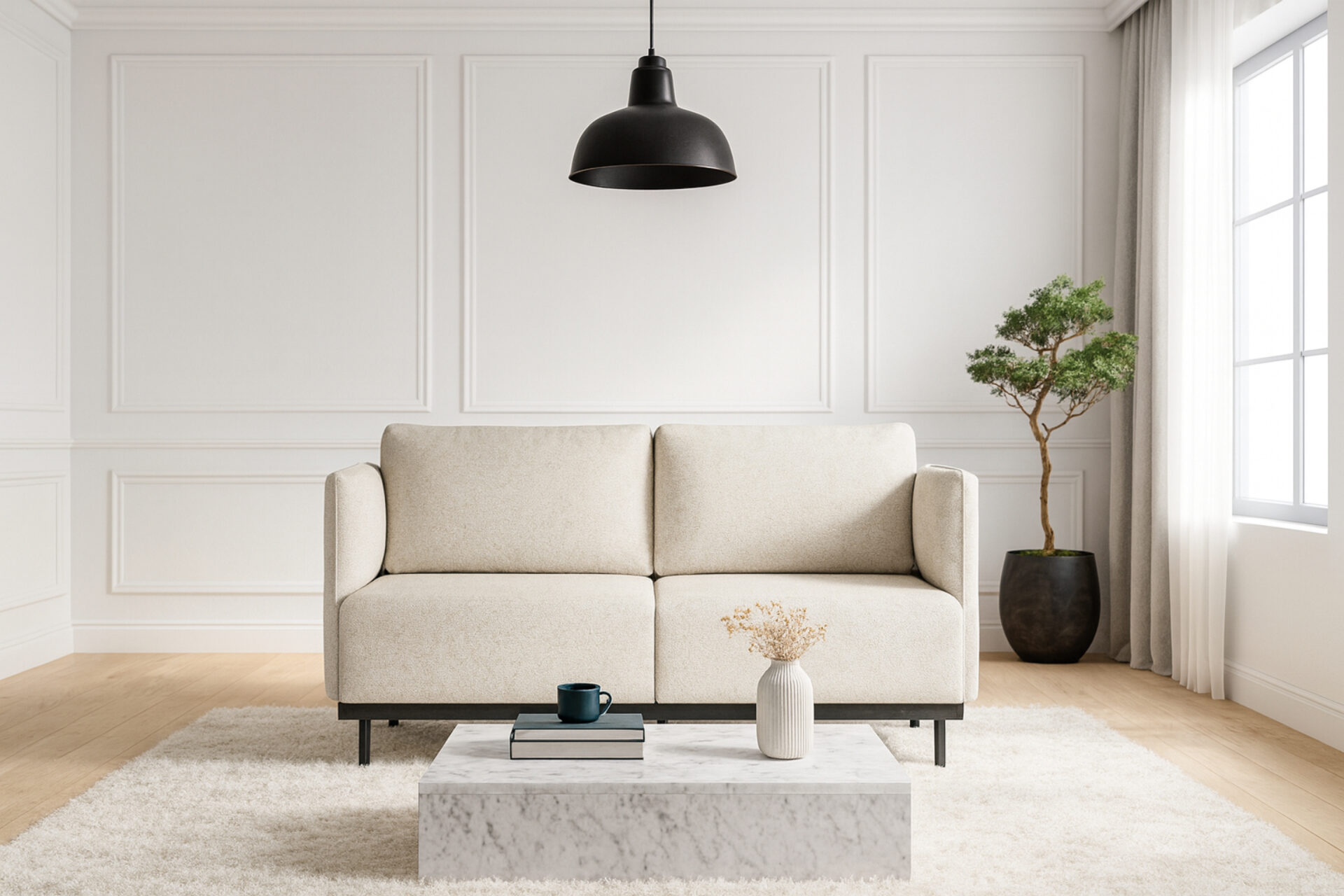 The Matilda Two Seater in White Bouclé blends minimalist elegance with comfort and practicality. Plush cushions, easy-care fabric, and a raised frame ensure effortless relaxation, simple maintenance, and timeless style for years to come.