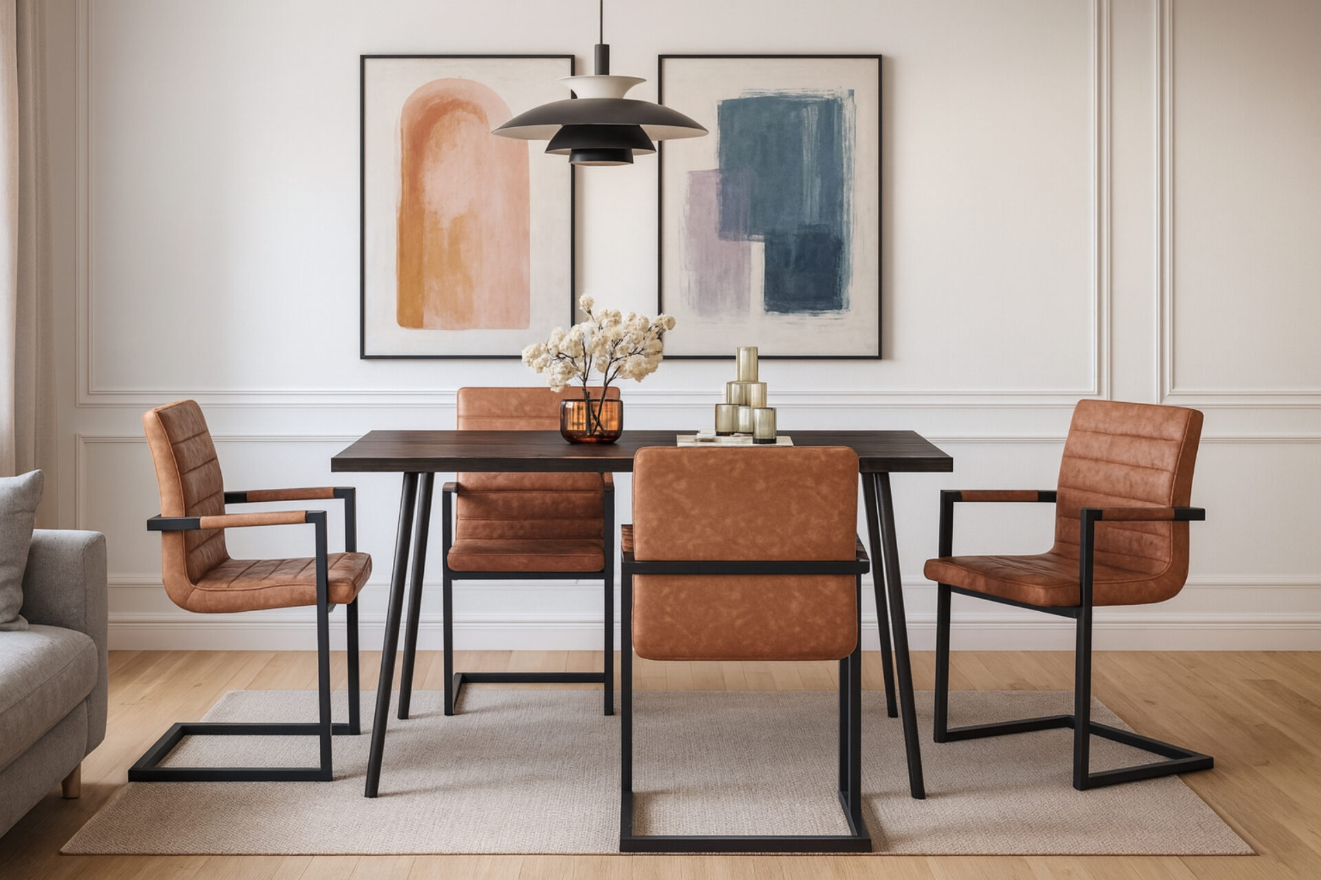 The Packard Brown dining chair features rich vegan leather and a strong steel frame, balancing timeless charm with everyday comfort. Its earthy brown tone adds warmth and versatility, grounding dining rooms, offices, or balconies in cozy style.