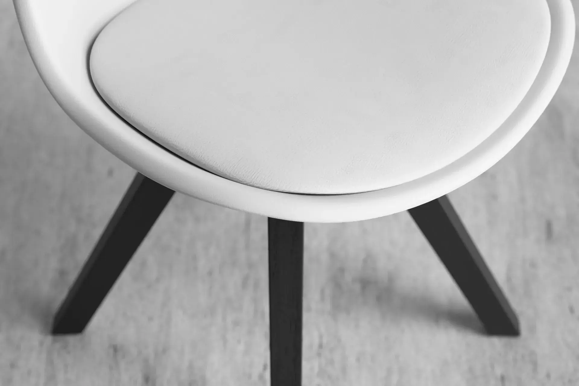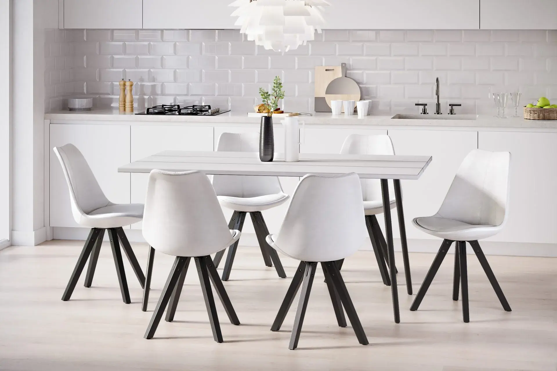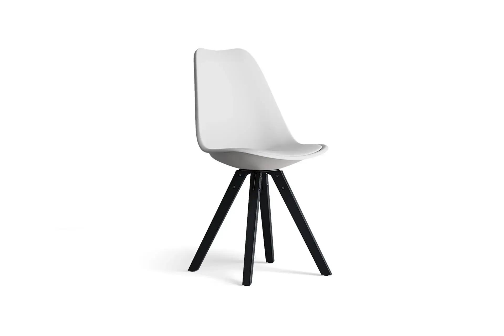 A vision of purity and contrast, this chair combines a crisp white vegan leather seat with bold black wooden legs for a timelessly chic pairing. Its clean design captures Nordic simplicity while offering strength and resilience for daily use. Perfect for bright dining rooms or refined interiors, the pairing creates a striking silhouette that elevates modern minimalism. Comfortable, durable, and elegant, this piece becomes a versatile addition that blends seamlessly with your décor while making every occasion feel fresh and inspired. -