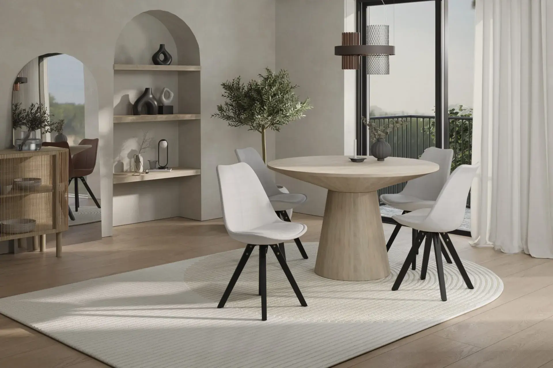 Crisp white leather meets striking black legs, giving the Wayner Chair an edge of modern chic. Its Nordic-inspired design brightens interiors with clarity and strength, while cushioned comfort invites lingering. This combination transforms any dining space into one that feels fresh, timeless, and unmistakably stylish.