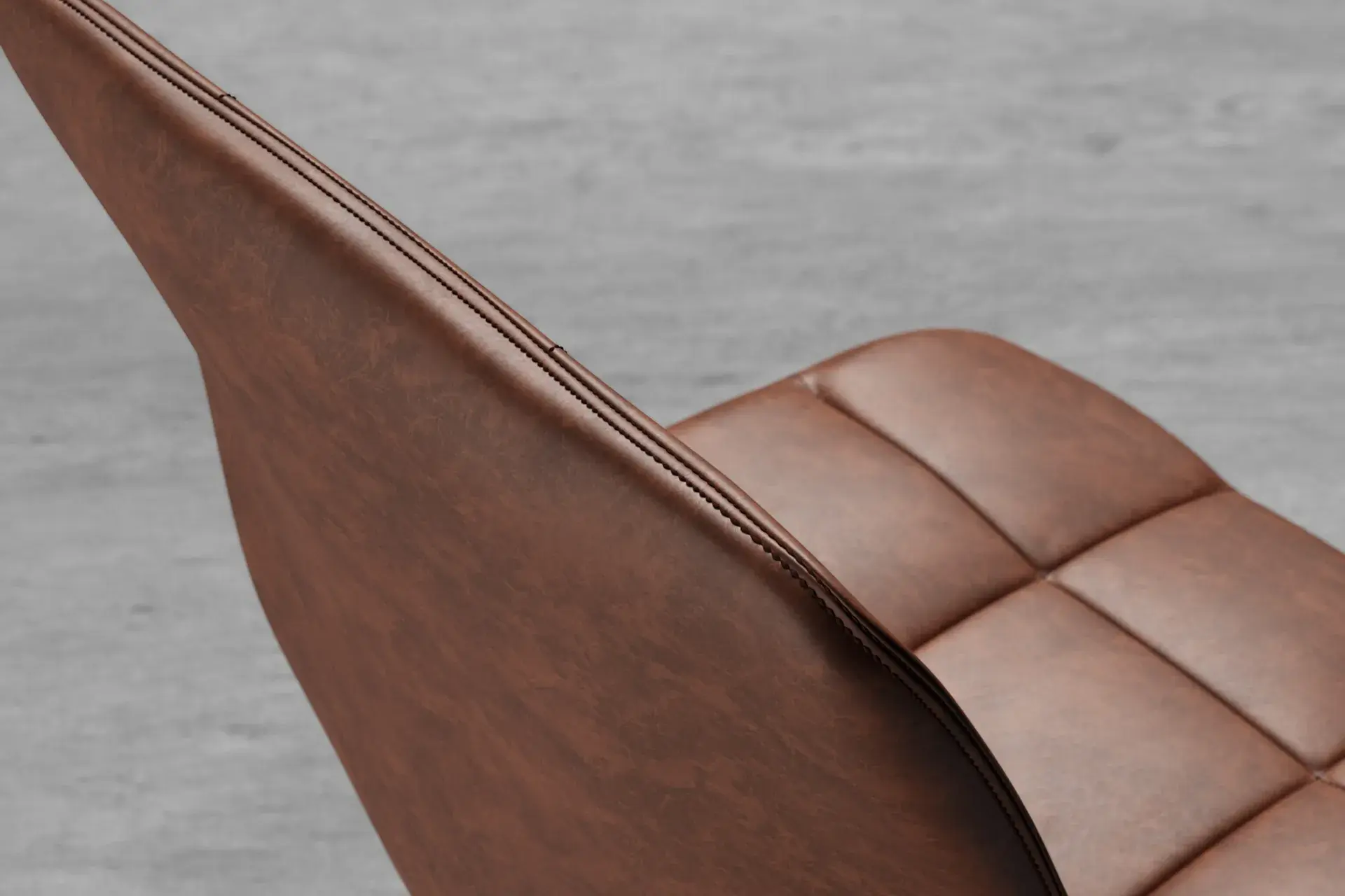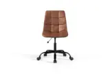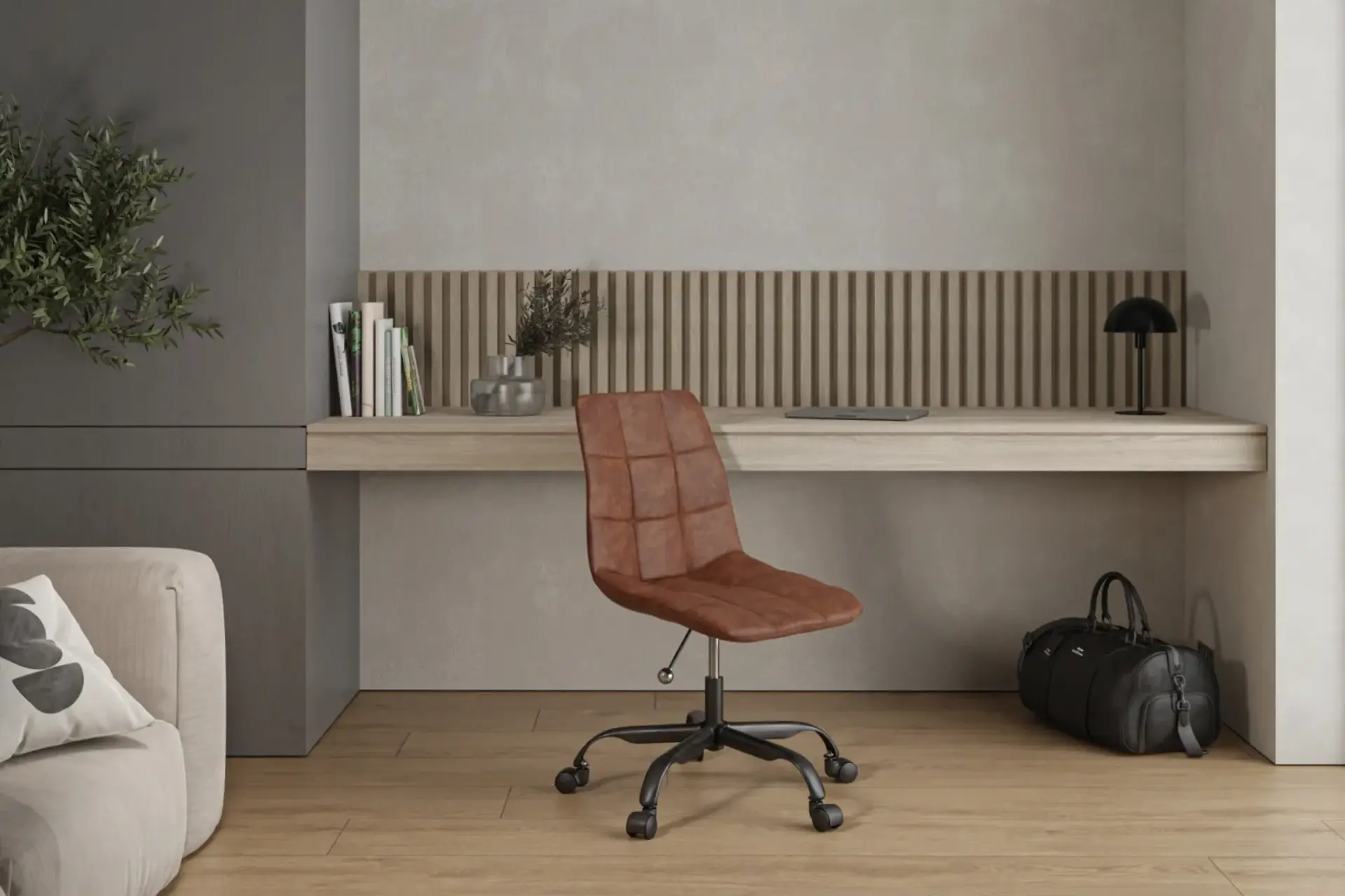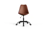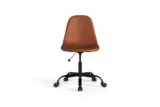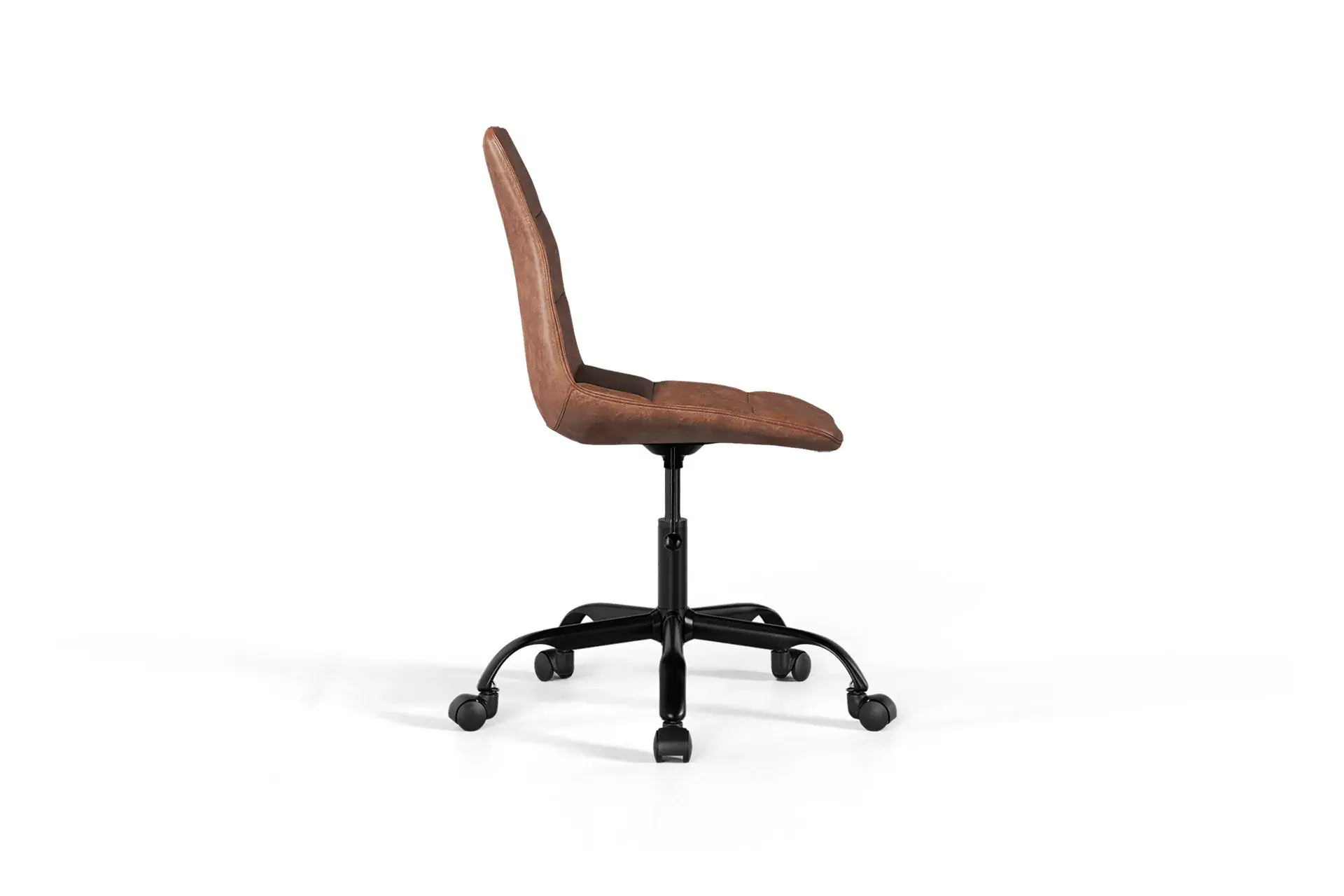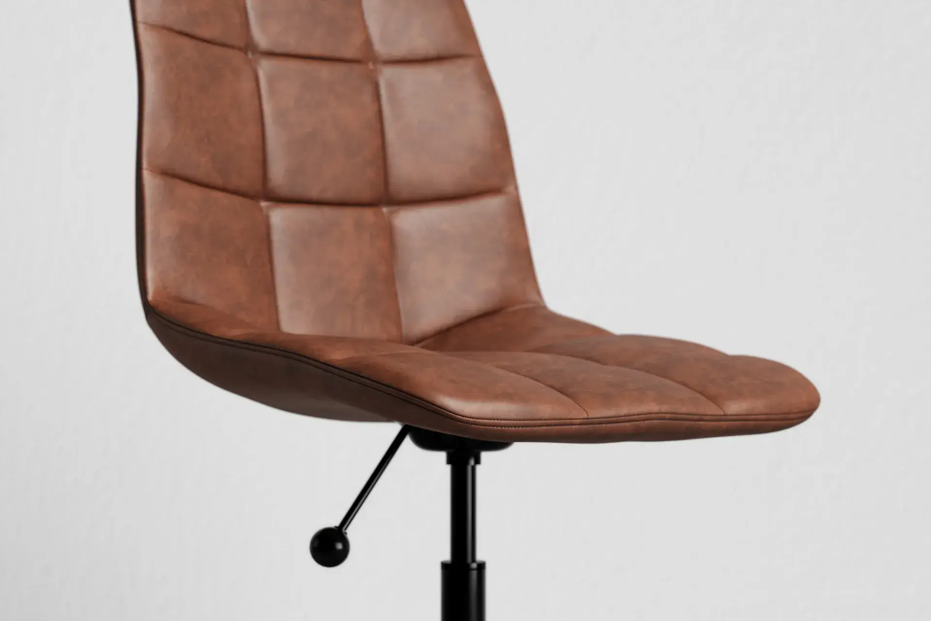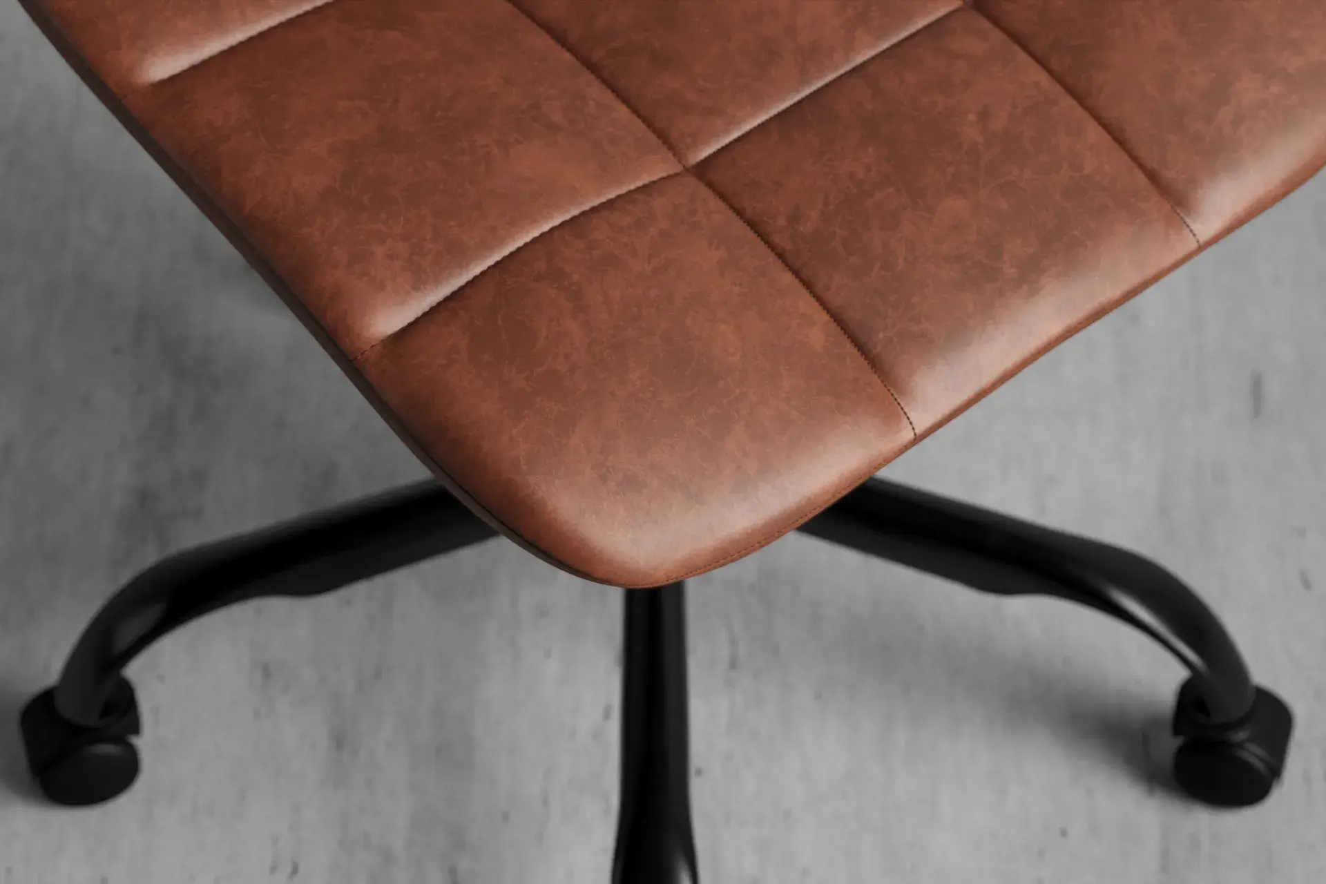 The Wolfgang Office Chair in brown vegan leather with a matte black base strikes the perfect balance of warmth and simplicity. Its flowing form and soft stitching create comfort that lasts. Smooth wheels, swivel motion, and height adjustment ensure flexibility, while the armless frame allows freedom to move. Crafted with durability and style in mind, it brings harmony to any workspace. -