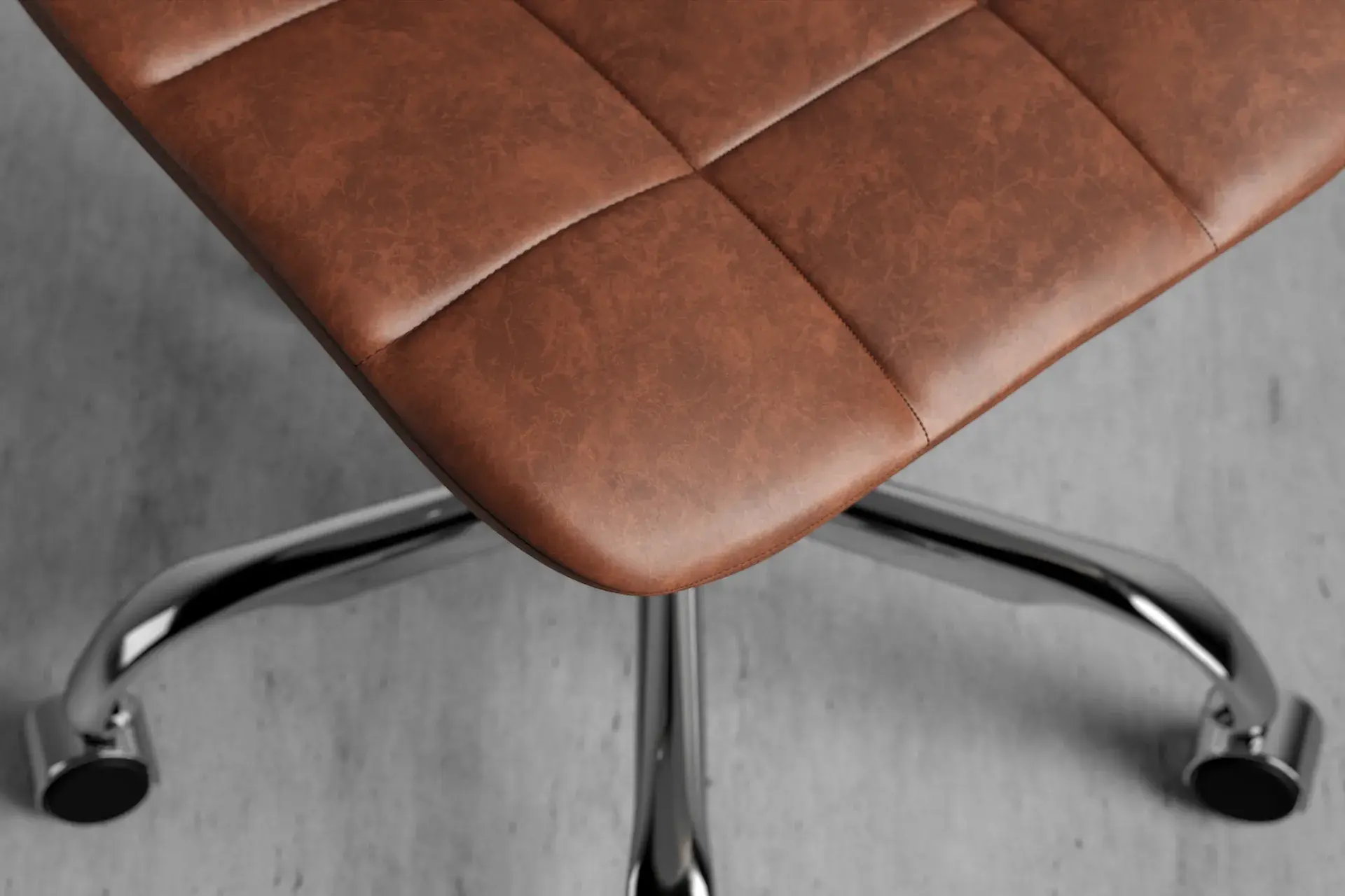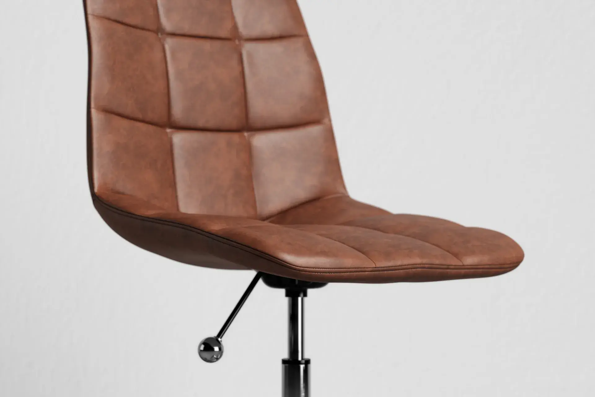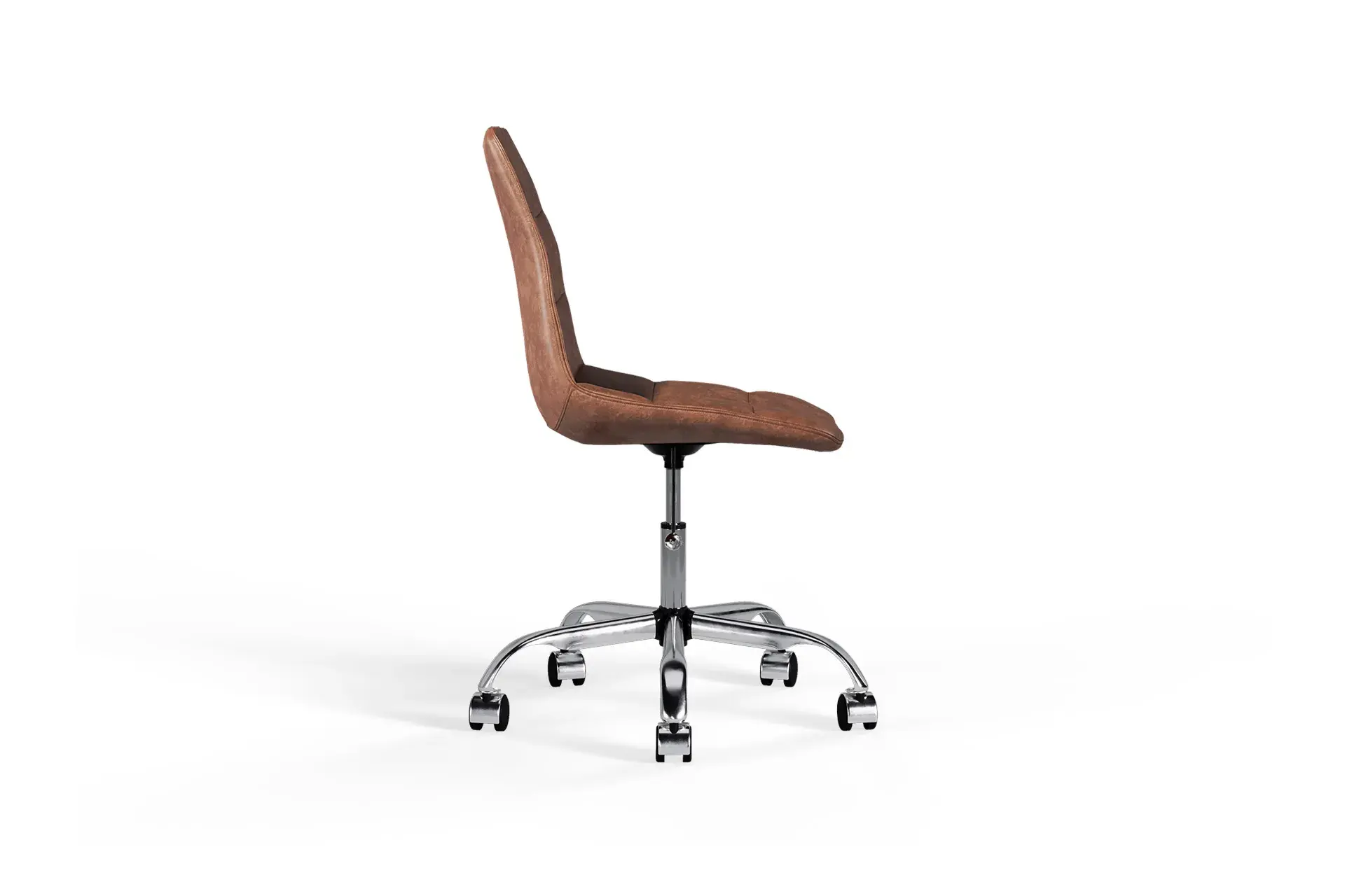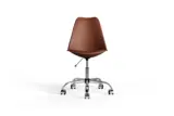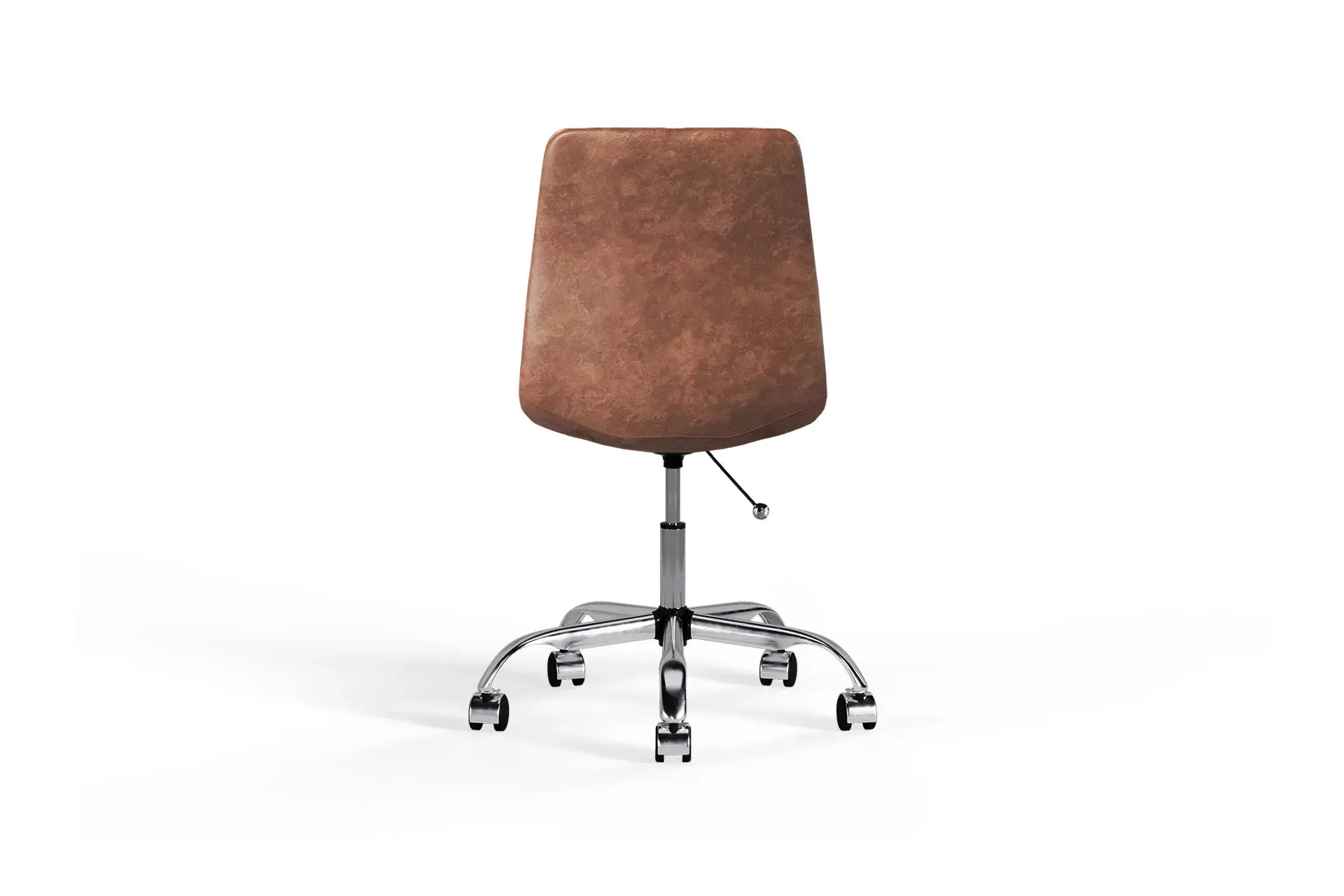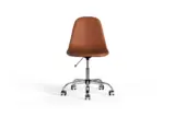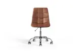 Warm and inviting, the Wolfgang Office Chair in brown vegan leather pairs comfort with modern flair. Its chrome base adds a polished touch, while breathable cross-stitching keeps you cool through long hours. With smooth wheels, swivel motion, and adjustable height, it adapts to your rhythm effortlessly. The armless design promotes freedom of movement, creating a workspace that feels balanced, productive, and comfortable all day. -