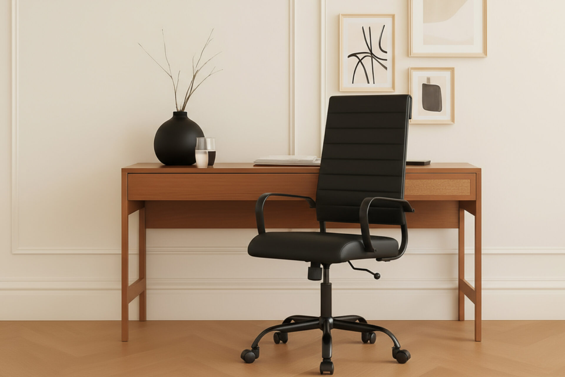 The Laguna High Back Office Chair with Wheels in Black Vegan Leather offers timeless sophistication and full ergonomic support. With a bold black base and smooth vegan leather finish, it elevates any office environment. Its high backrest, massage-like lumbar support, and adjustable features encourage healthy posture and long-lasting comfort, even during extended work sessions. Built with 360° swivel mobility and durable components, Laguna adapts seamlessly to modern professional life. More than furniture, it transforms your workspace into a calm, stylish retreat that inspires productivity every day. -