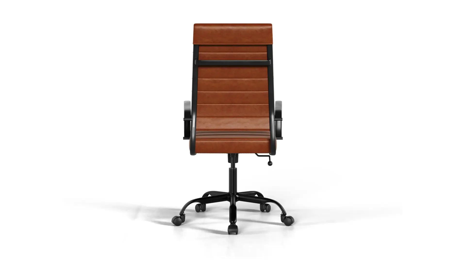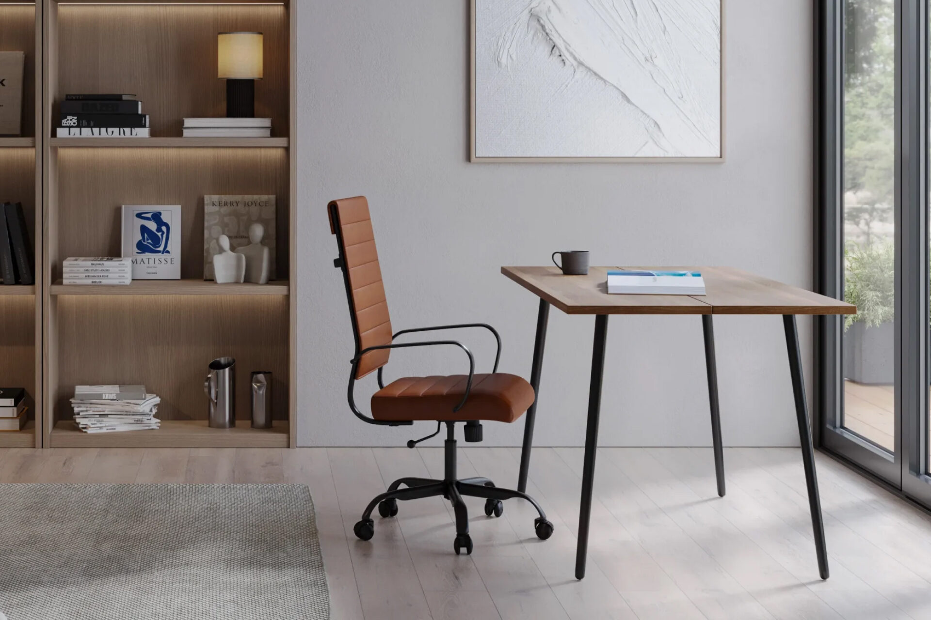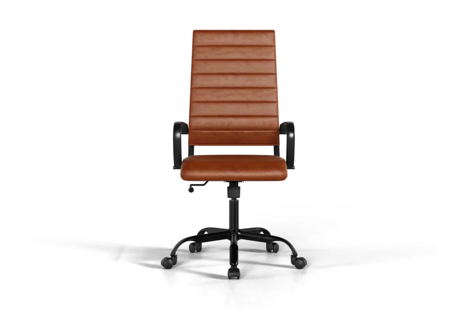 The Laguna High Back Office Chair with Wheels in Brown Vegan Leather and Black Base embodies timeless sophistication with modern ergonomic care. Its tall backrest, supple vegan leather, and strong black base bring warmth and elegance to any workspace. Designed with lumbar support, a knee-tilt mechanism, and adjustable height, it promotes natural posture and lasting comfort. With 360° swivel and durable components, Laguna adapts seamlessly to your working rhythm. More than a chair, it transforms offices into calm, stylish retreats for everyday productivity. -