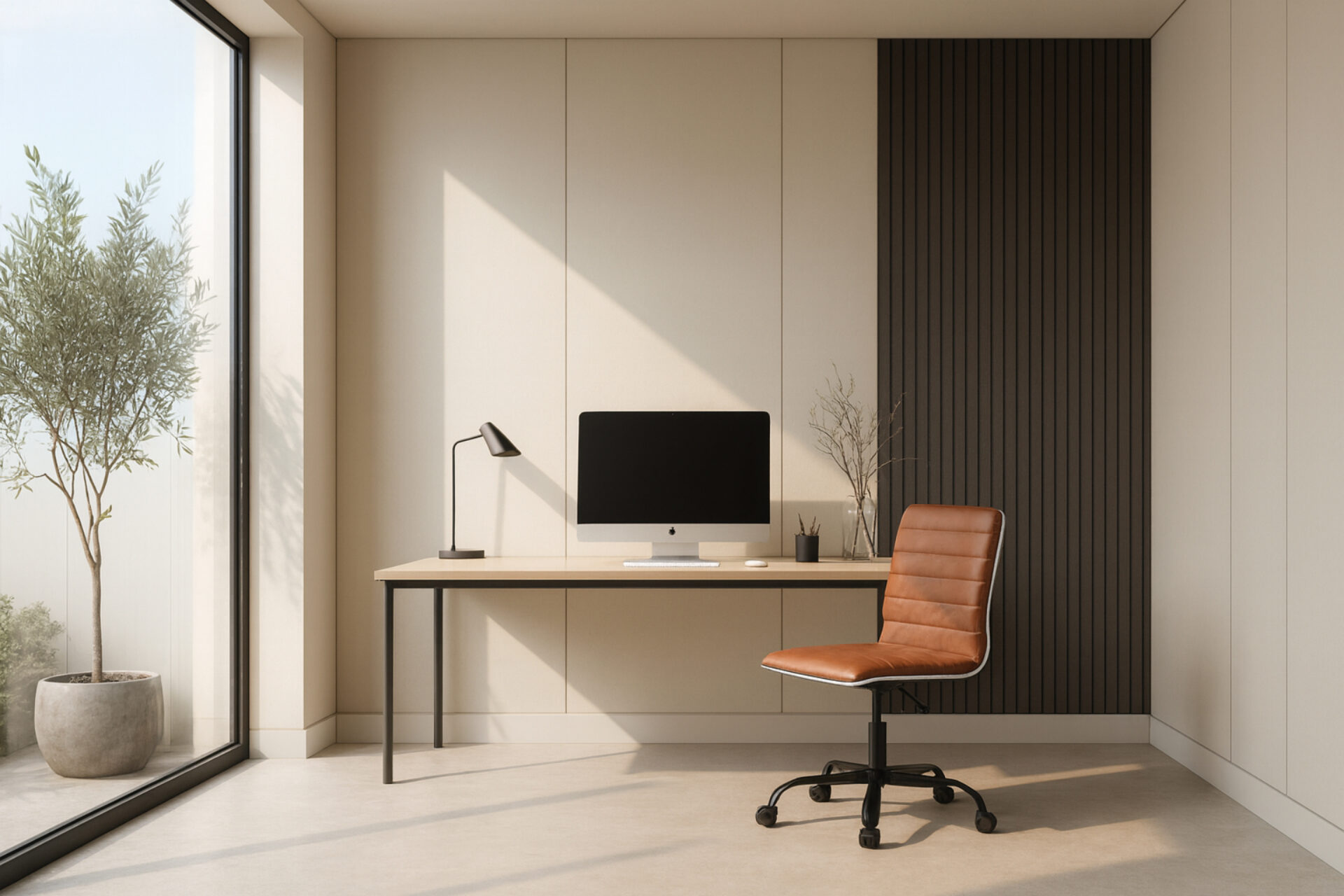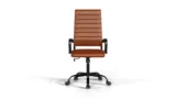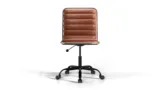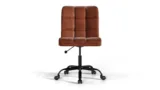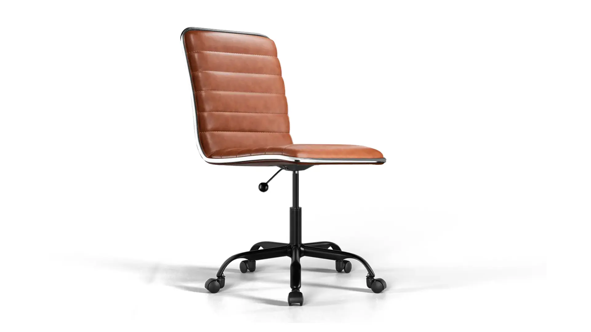 The Dinamo Office Chair in Brown Vegan Leather with Black Base and Wheels offers warmth, functionality, and modern elegance. Its armless silhouette ensures flexibility, while cushioned seating and vegan leather upholstery provide support and comfort. A bold black base and whisper-quiet wheels deliver stability and effortless mobility, making it perfect for stylish home or professional offices. -