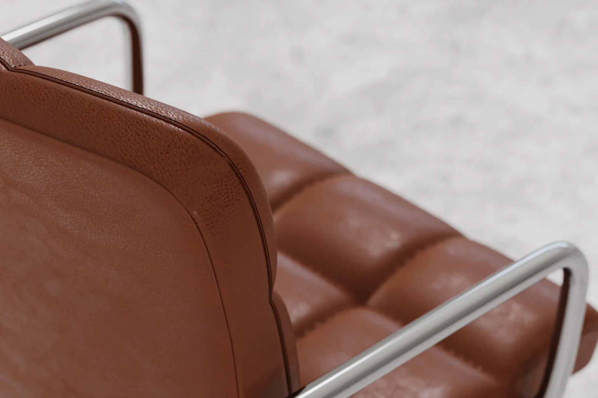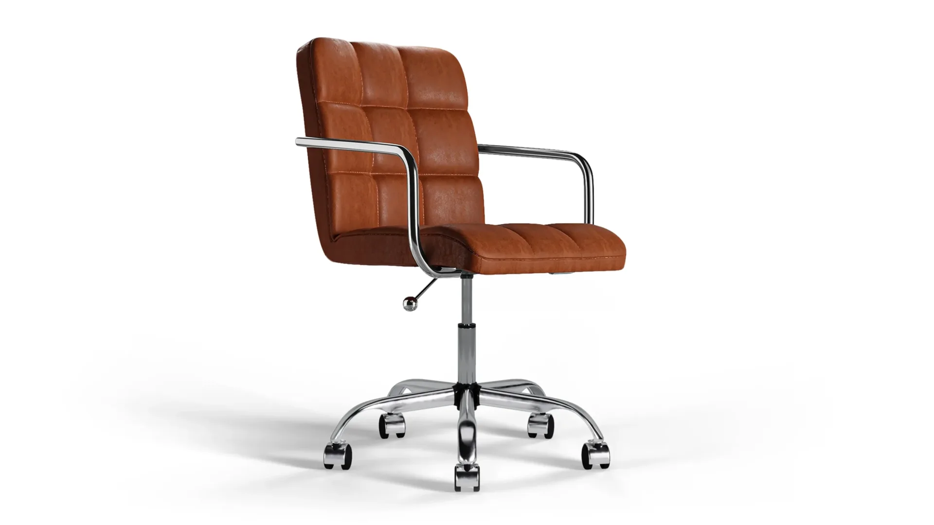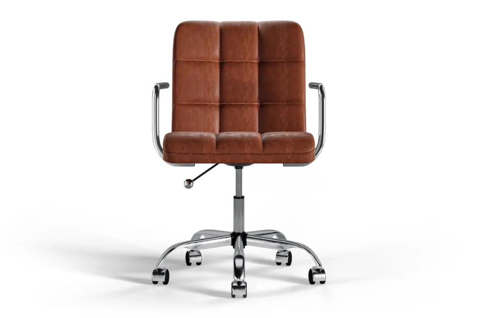 The Futura Office Chair in Brown Vegan Leather with Chrome Base and Wheels combines timeless style with ergonomic design. Upholstered in supple vegan leather, with breathable stitching and adjustable height, it promotes lasting comfort. A polished chrome base and smooth-glide wheels add mobility, making it versatile for any workspace. -
