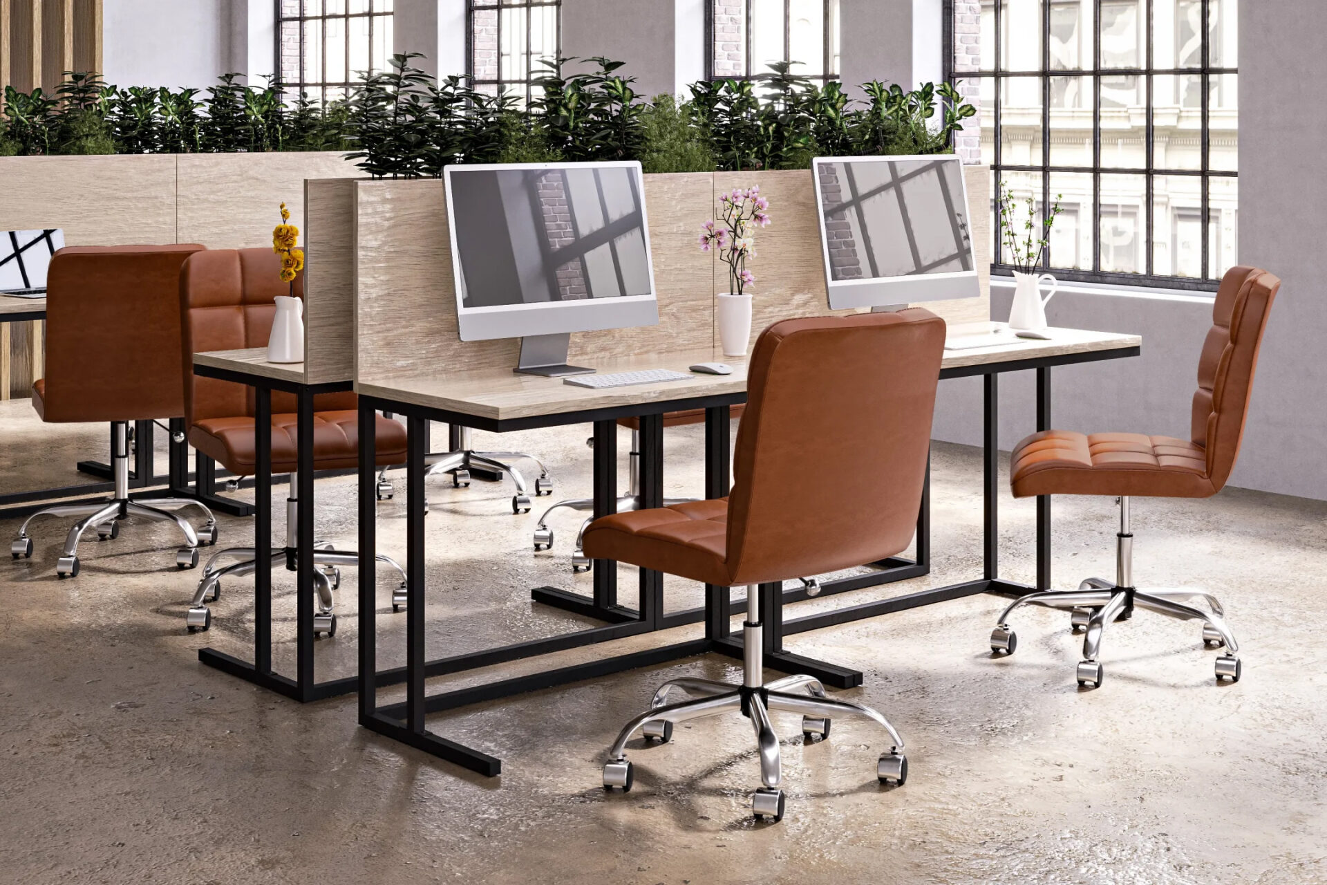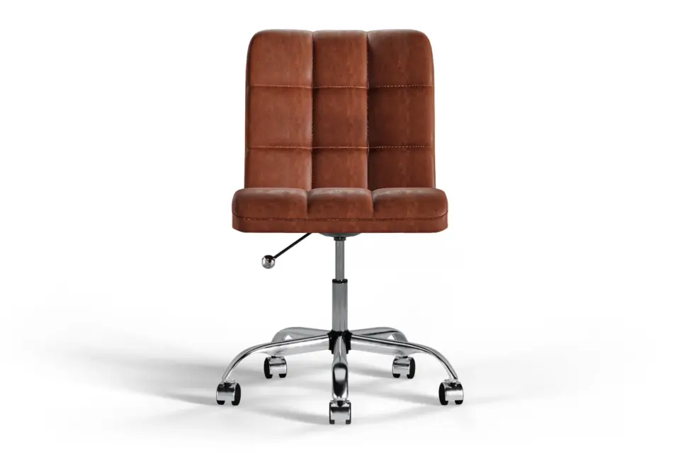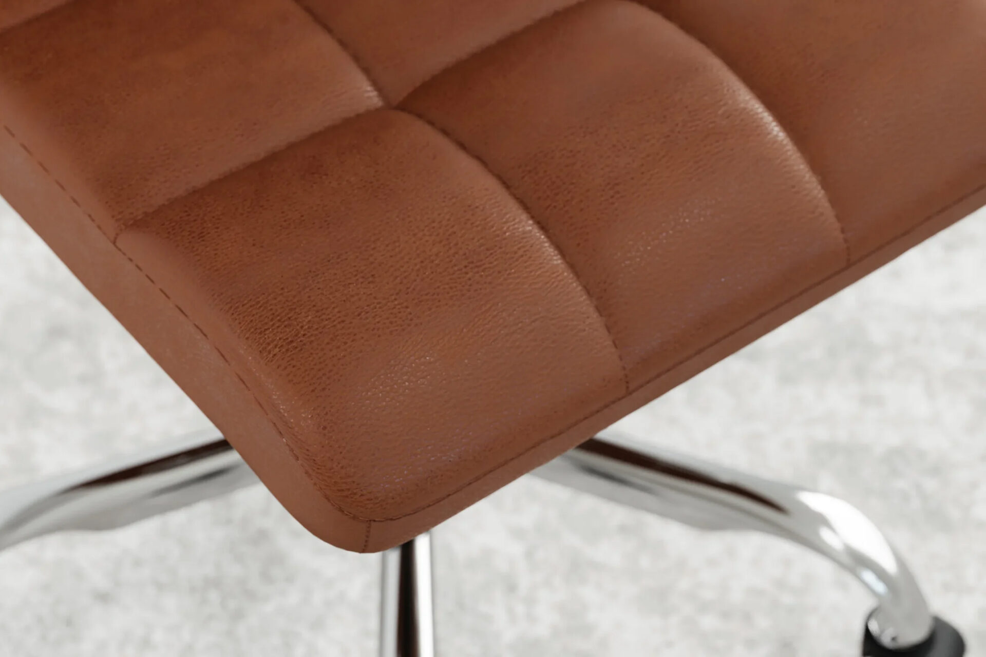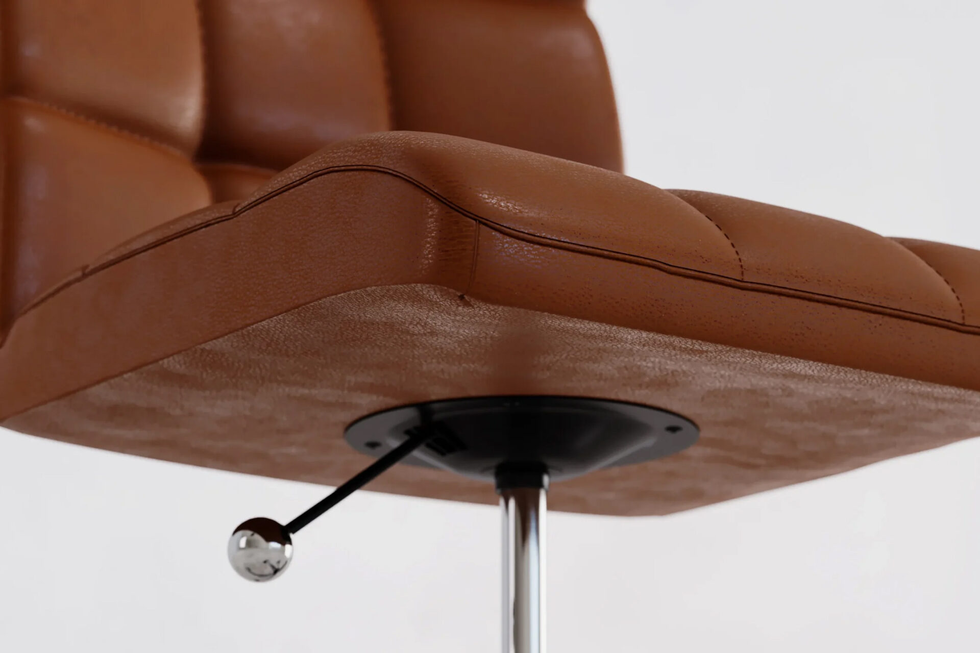 The Futura Eco Office Chair in Brown Vegan Leather with Chrome Base and Wheels merges sustainability with modern design. Crafted from eco-conscious vegan leather with breathable stitching, it provides comfort and durability. Smooth wheels and a polished chrome base ensure mobility, making it ideal for productive office spaces. -
