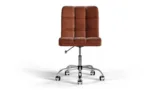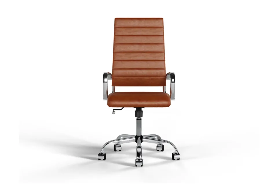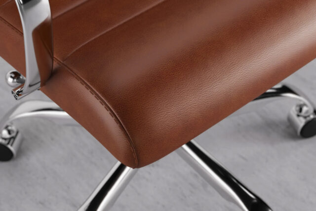 The Laguna High Back Office Chair with Wheels in Brown Vegan Leather and Chrome Base combines bold sophistication with ergonomic care. Upholstered in warm vegan leather and set on a polished chrome base, it adds depth and modern elegance to any workspace. A tall backrest, lumbar support, and adjustable features promote natural posture and long-lasting wellbeing, even during long workdays. With 360° swivel mobility and high-quality craftsmanship, Laguna delivers comfort, style, and performance in equal measure—transforming your workspace into a refined retreat. -