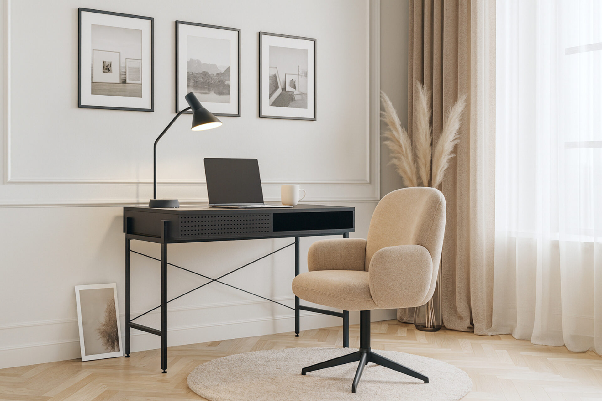 Compact and refined, the 90 x 50 cm black Palmer Desk brings sophistication to smaller interiors. Its versatile design works beautifully as a workspace or vanity, with an innovative sliding panel to keep essentials within reach. Protective details ensure noise-free movement and floor safety, while its minimalist form blends function with style. Crafted with lasting quality and quiet confidence, it’s an elegant addition to any modern home or studio, where design and purpose meet in perfect balance. -