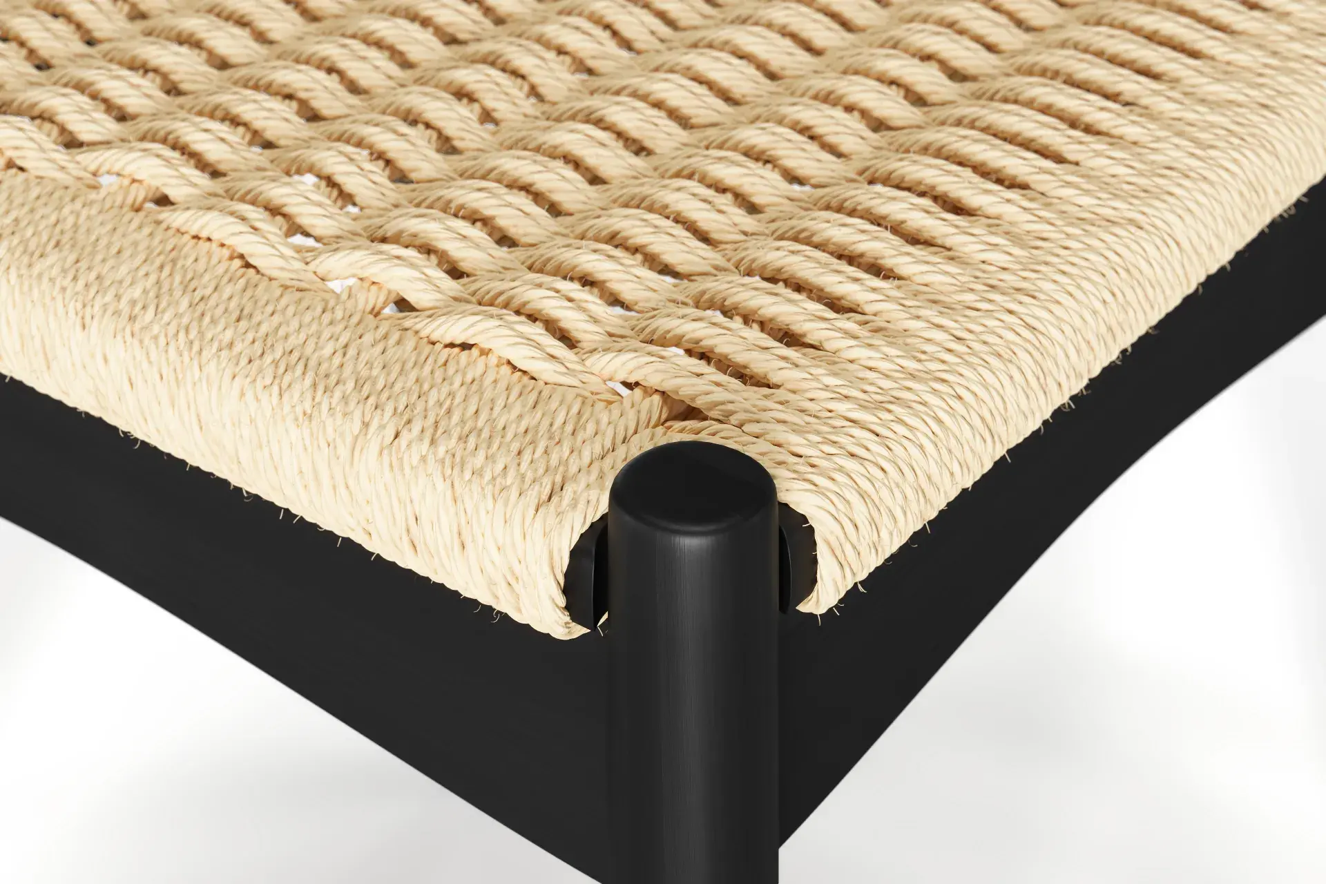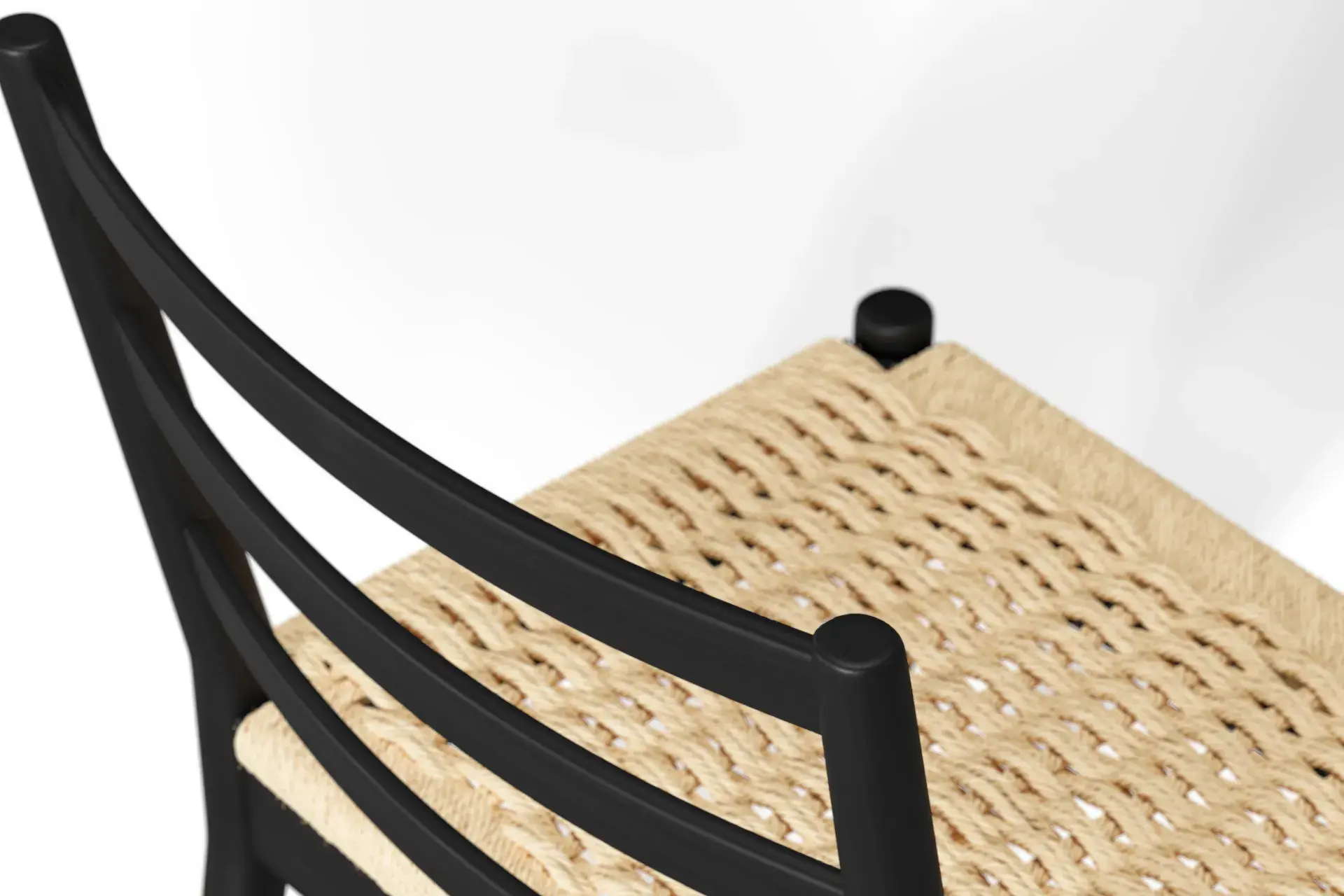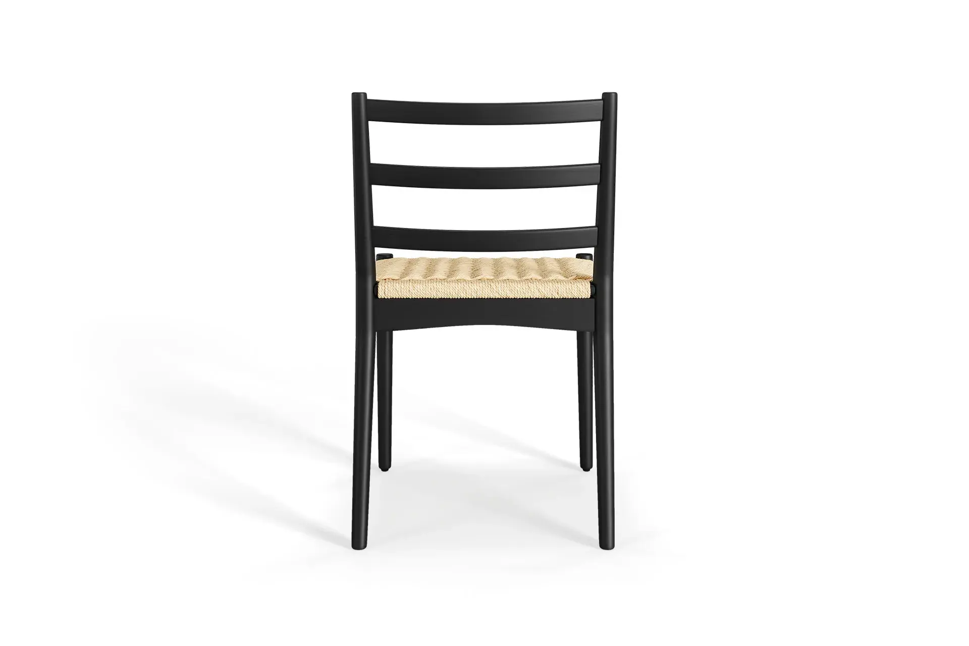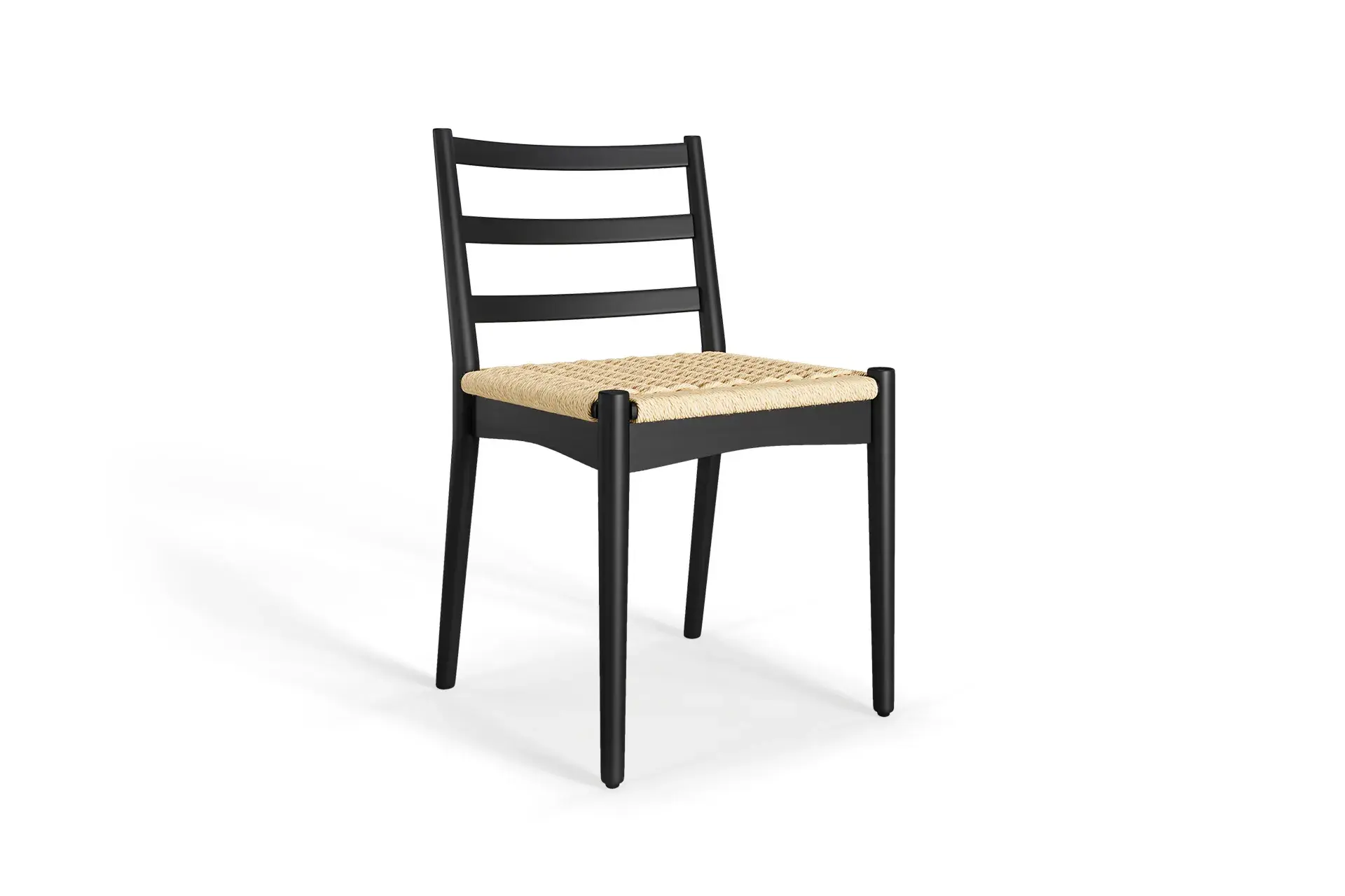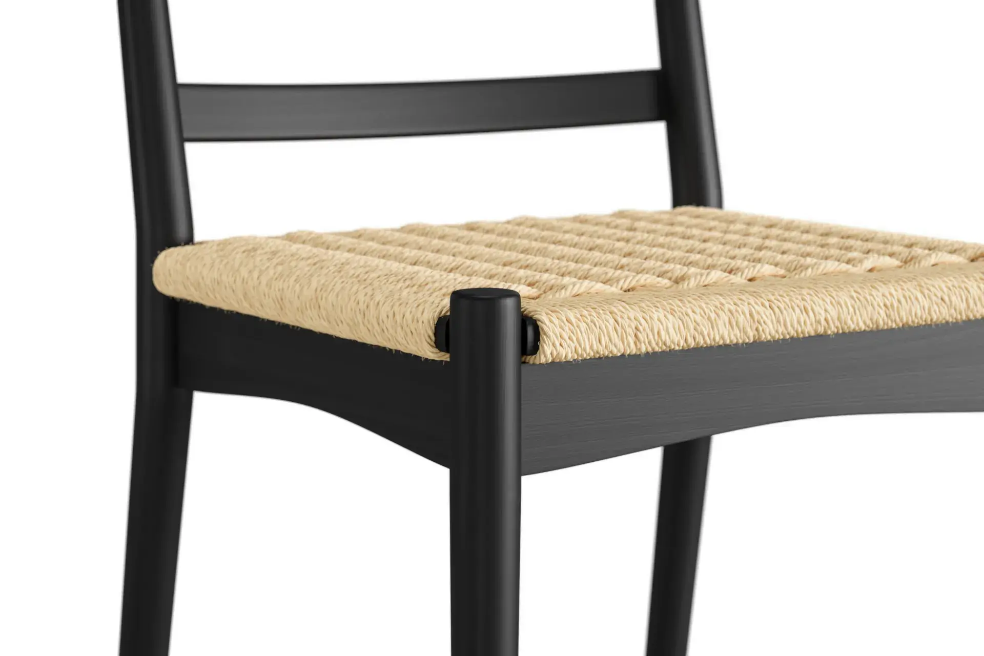 Crafted from solid wood with a deep black finish, the Raylan Chair pairs bold contrast with natural warmth. Its handwoven paper cord seat adds breathability, while the curved backrest ensures ergonomic comfort—bringing timeless sophistication and balance to your dining space.