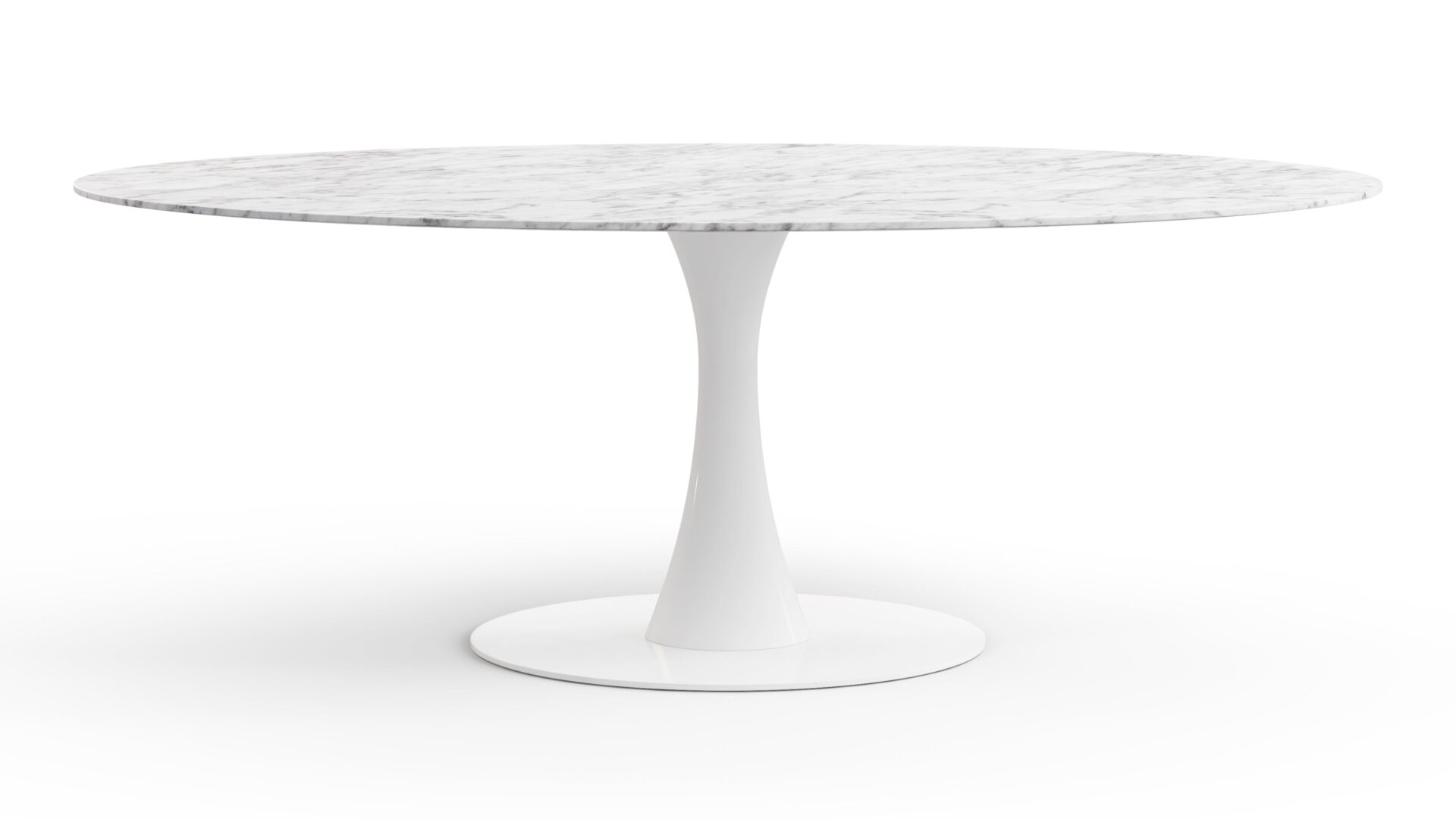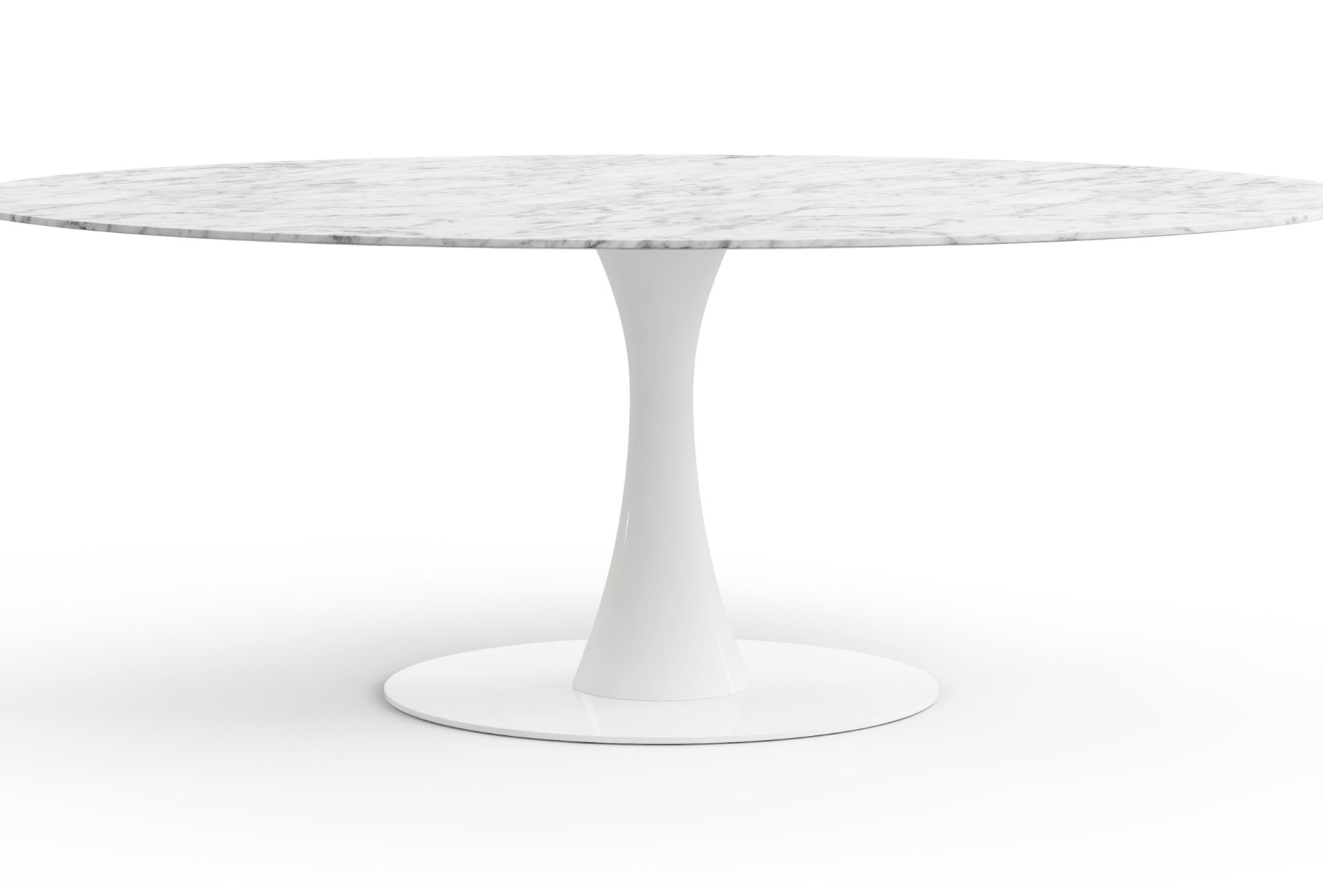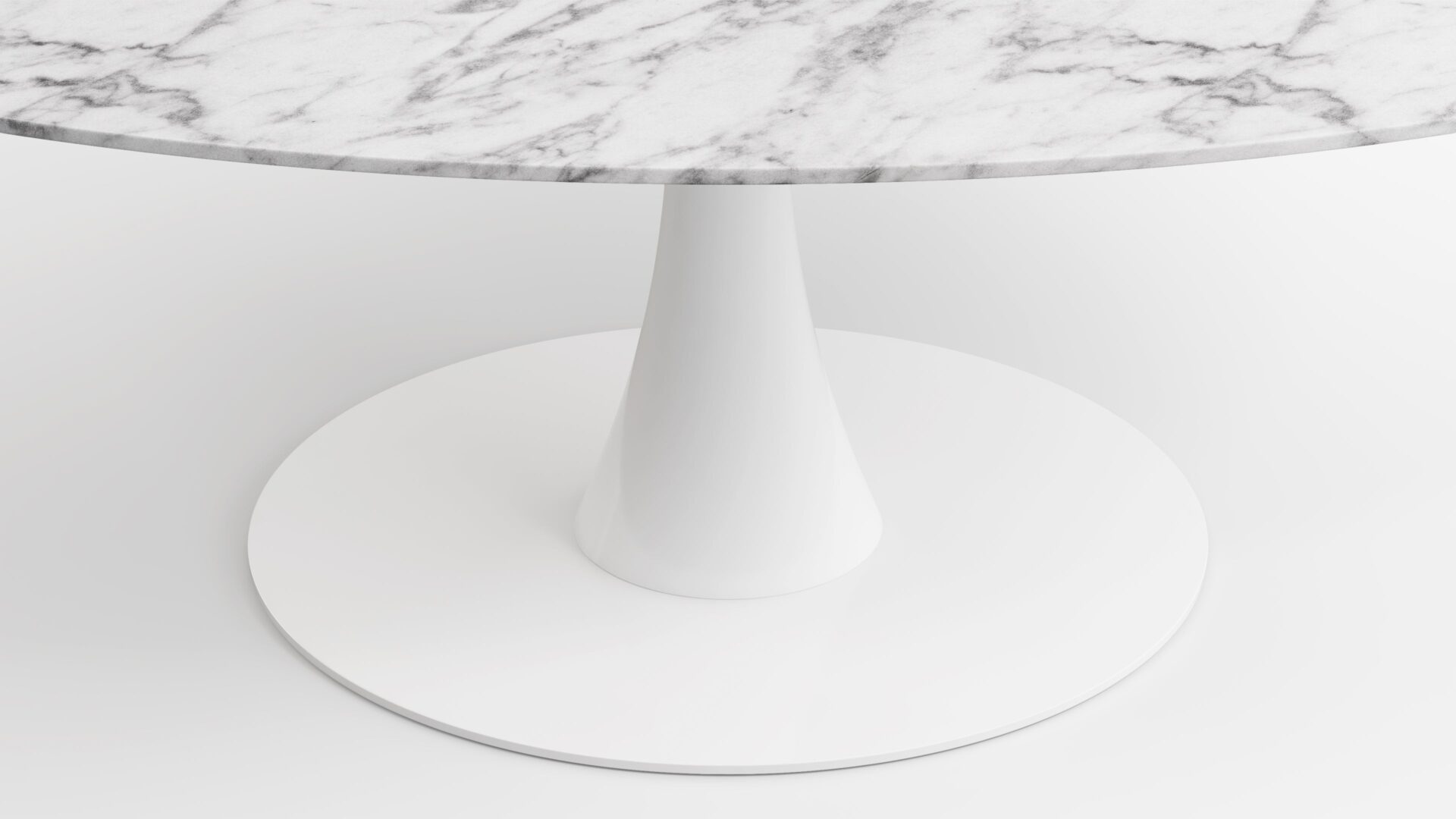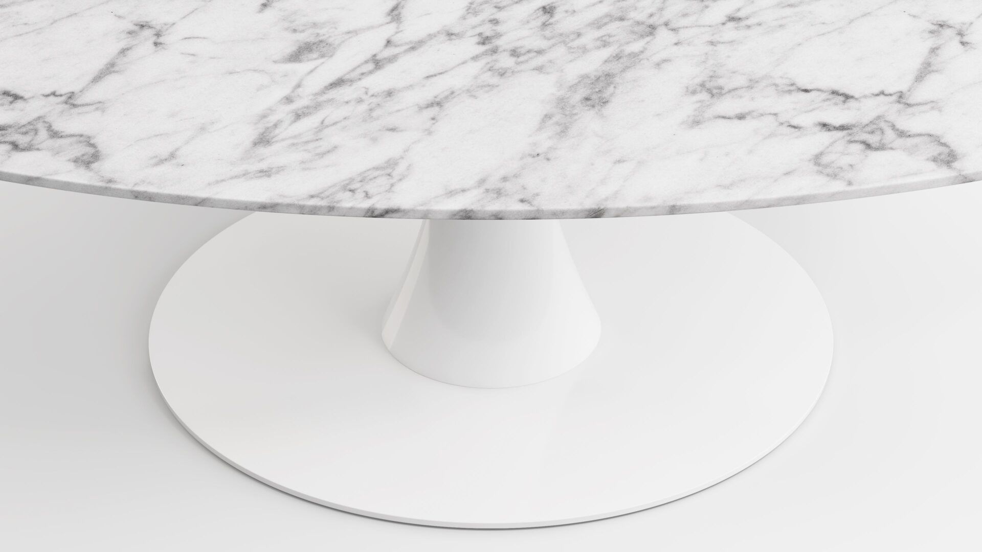 Introducing the sleek and stylish Aarhus Table, boasting a chic design with a pedestal base that elevates your dining experience. Inspired by mid-1950s futuristic aesthetics, this multi-functional piece doubles as a dining table or contemporary desk. Crafted with Carrara marble, it offers timeless elegance and effortless upkeep, perfect for modern homes seeking a touch of sophistication.