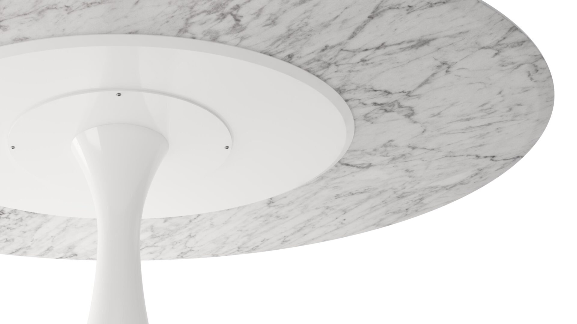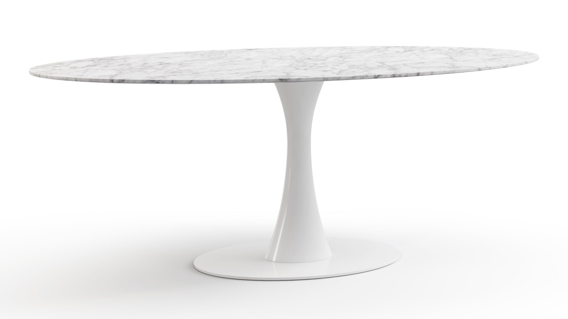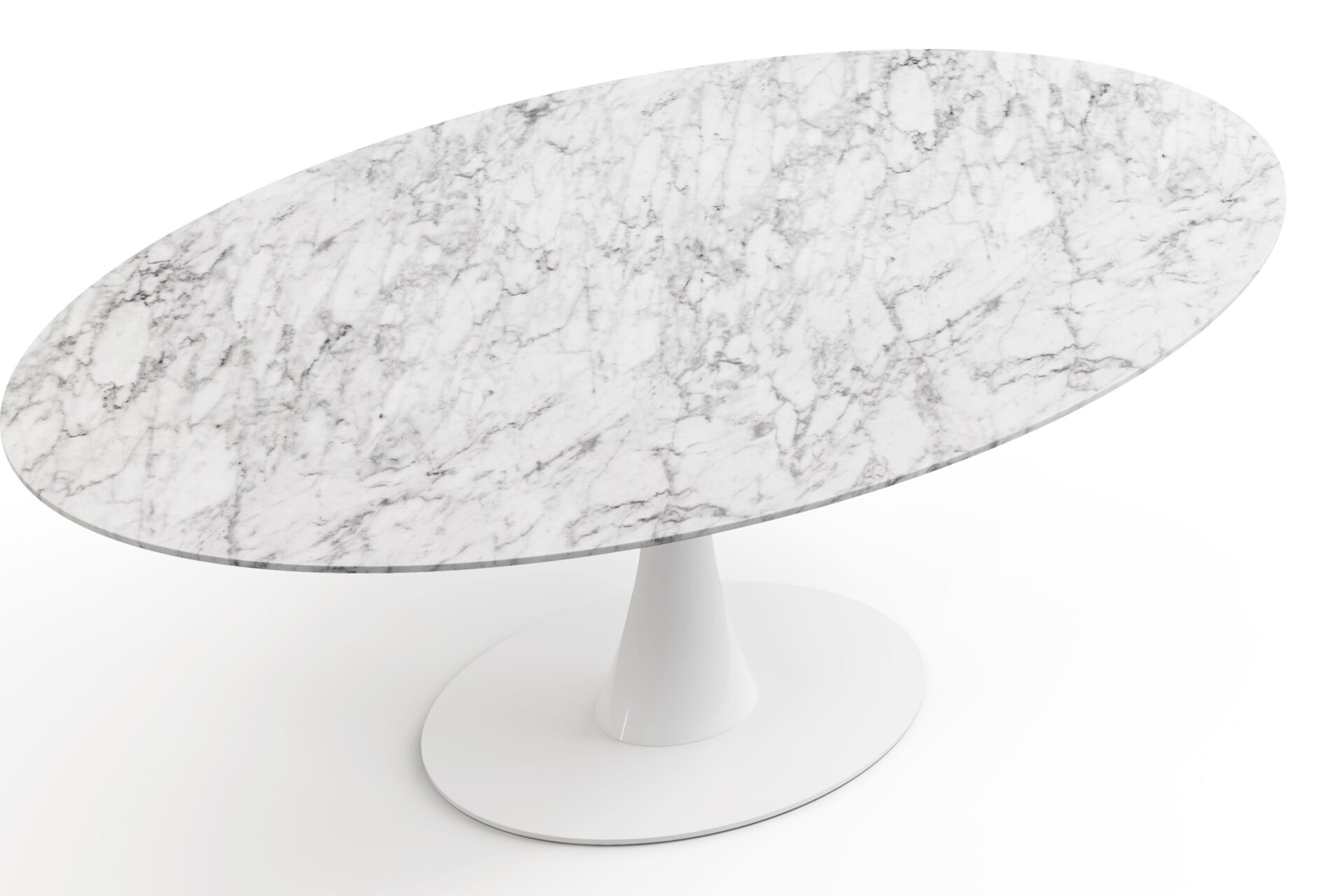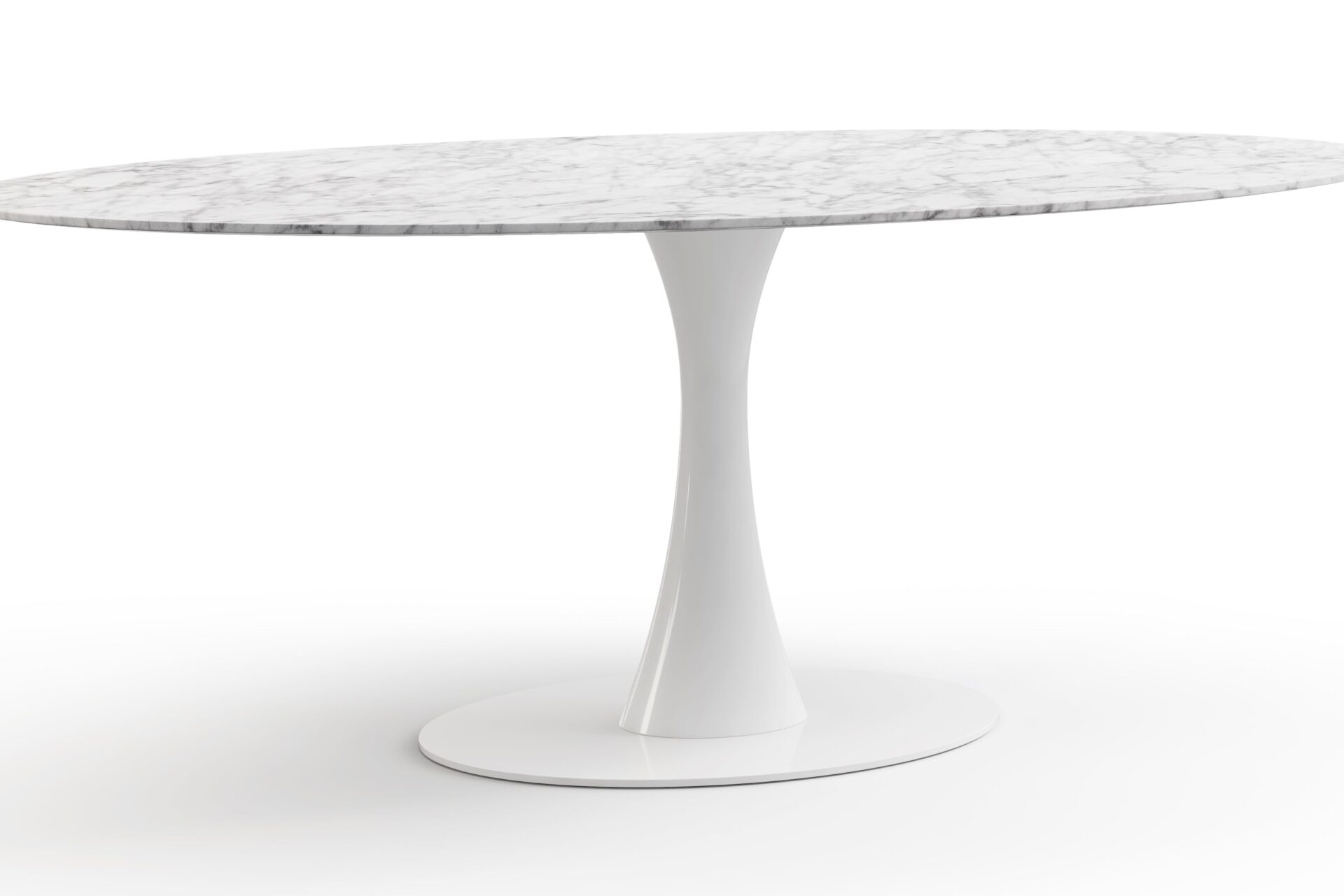 Introducing the sleek and stylish Aarhus Table, boasting a chic design with a pedestal base that elevates your dining experience. Inspired by mid-1950s futuristic aesthetics, this multi-functional piece doubles as a dining table or contemporary desk. Crafted with Carrara marble, it offers timeless elegance and effortless upkeep, perfect for modern homes seeking a touch of sophistication.