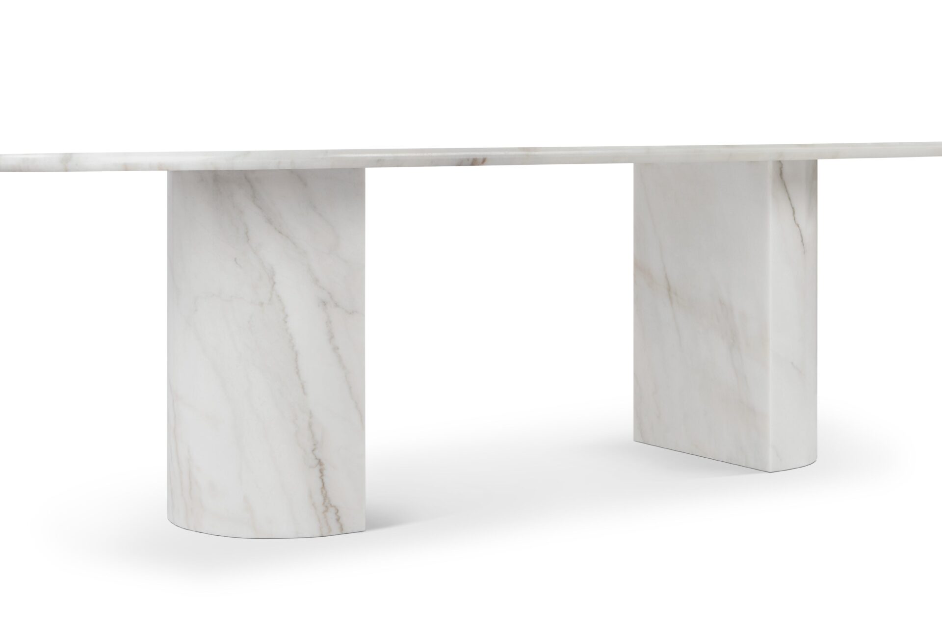 Elevate your space with the Dante dining table, featuring a lavish marble coating from top to bottom. A modern interpretation of the timeless double pedestal table, this opulent piece is crafted to enhance sophisticated, luxurious interiors.