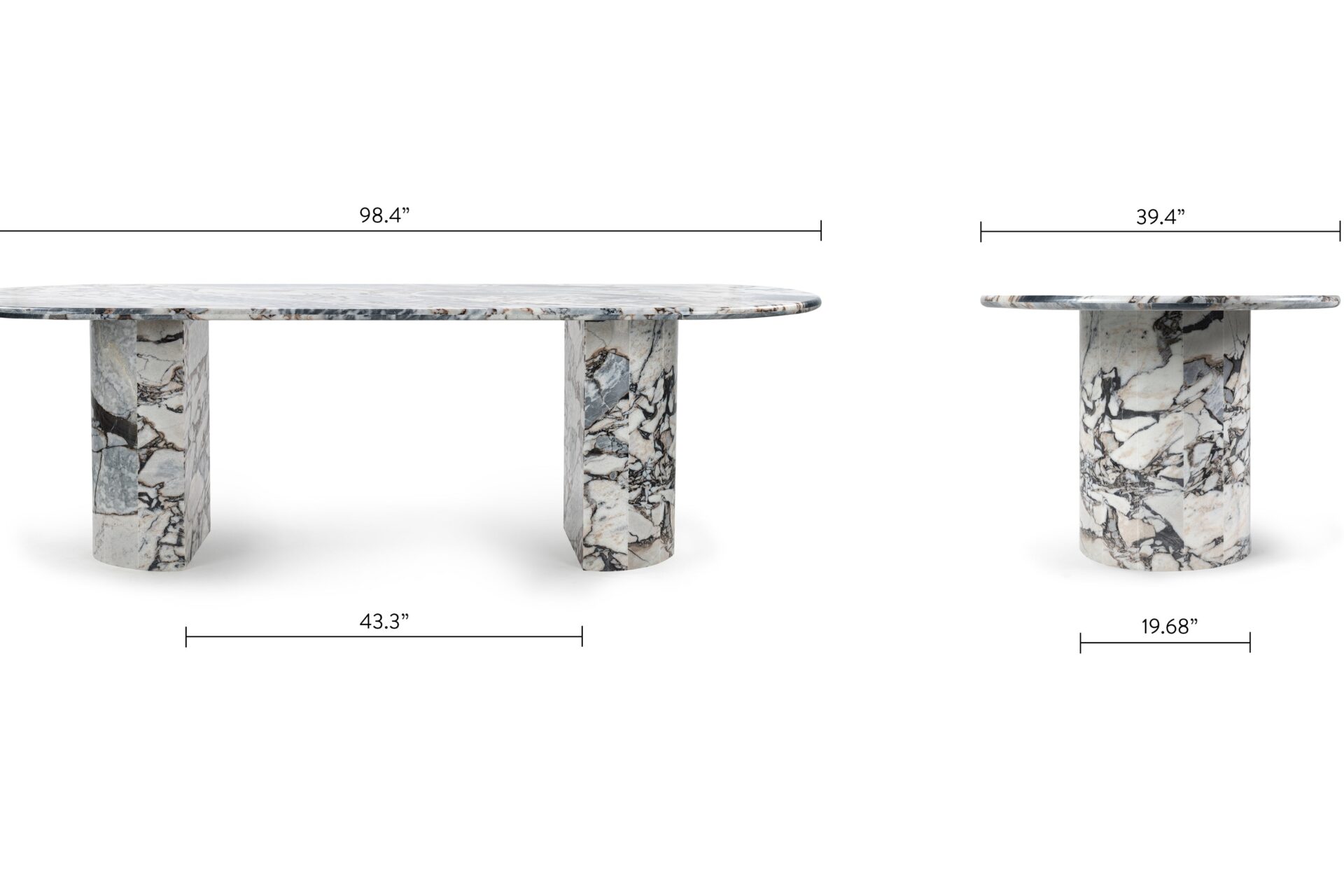 The Dante Dining Table is the perfect choice for spacious dining areas, whether large or open-plan. Representing elegance at its finest, this dining table boasts a sleek and uncluttered design that beautifully complements the luxurious Italian modellato marble it showcases. Featuring a refined polished finish, the marble dining table serves as a remarkable centerpiece for dining and entertaining. Its expansive 98” top is upheld by two half-moon column legs that exude classical architectural charm while embracing a modern and contemporary appeal.