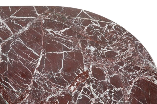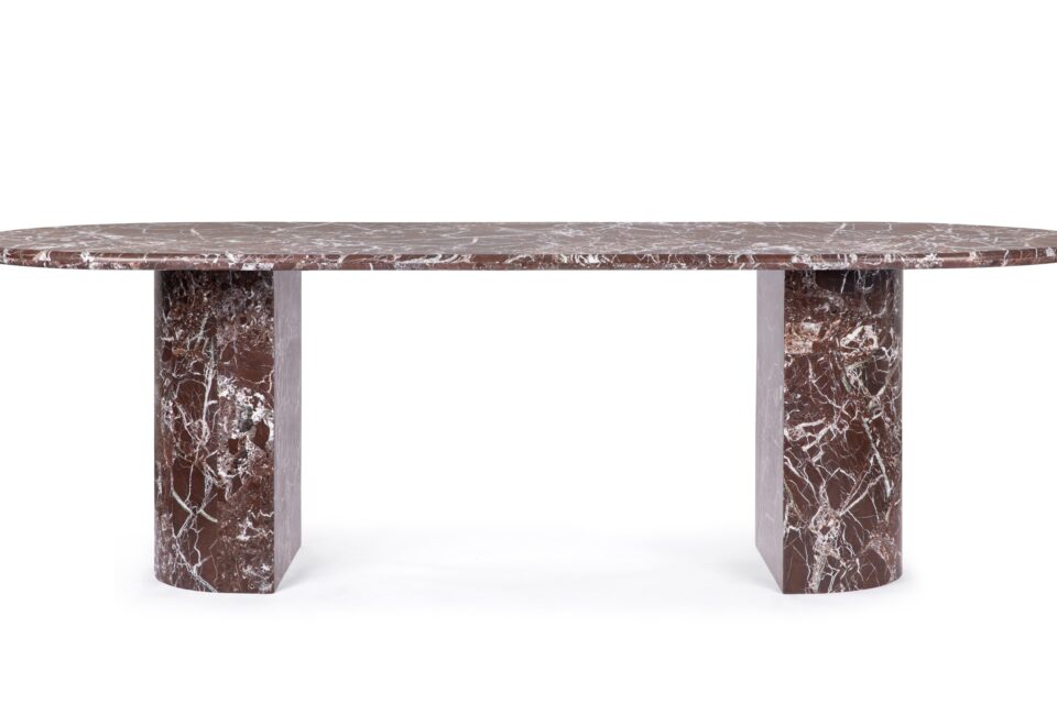 Elevate your dining experience with the luxurious Dante dining table, featuring exquisite Rosso Levanto Marble. Standing as the ultimate statement piece, this modern twist on the traditional double pedestal table adds a contemporary touch to upscale interiors. With unique variations in appearance, including distinct color patterns and natural veining, this opulent piece exudes classic elegance redefined for modern living.