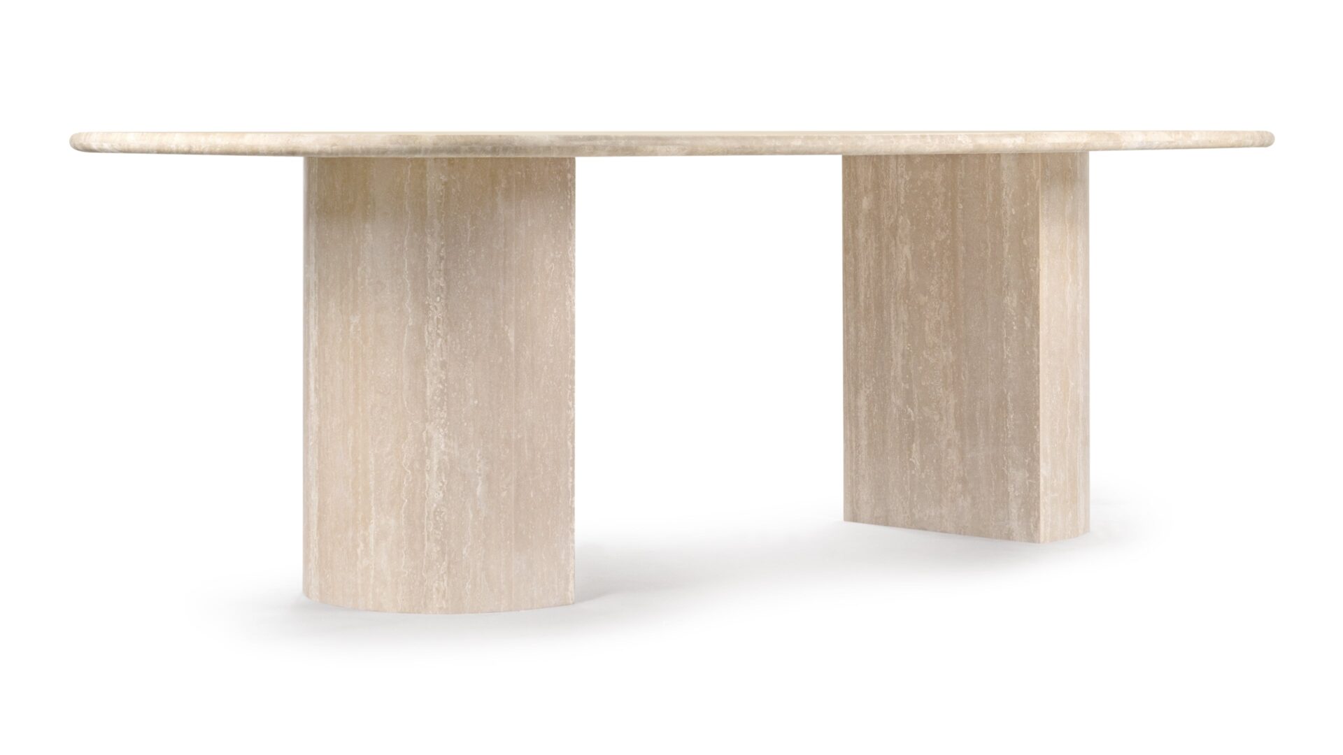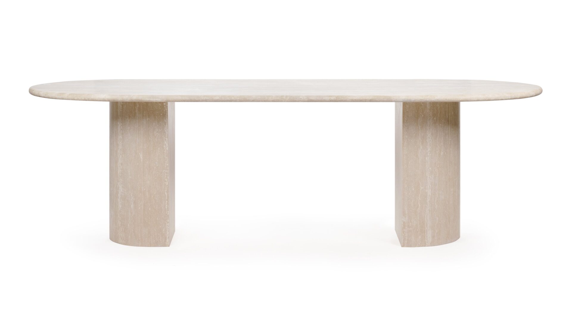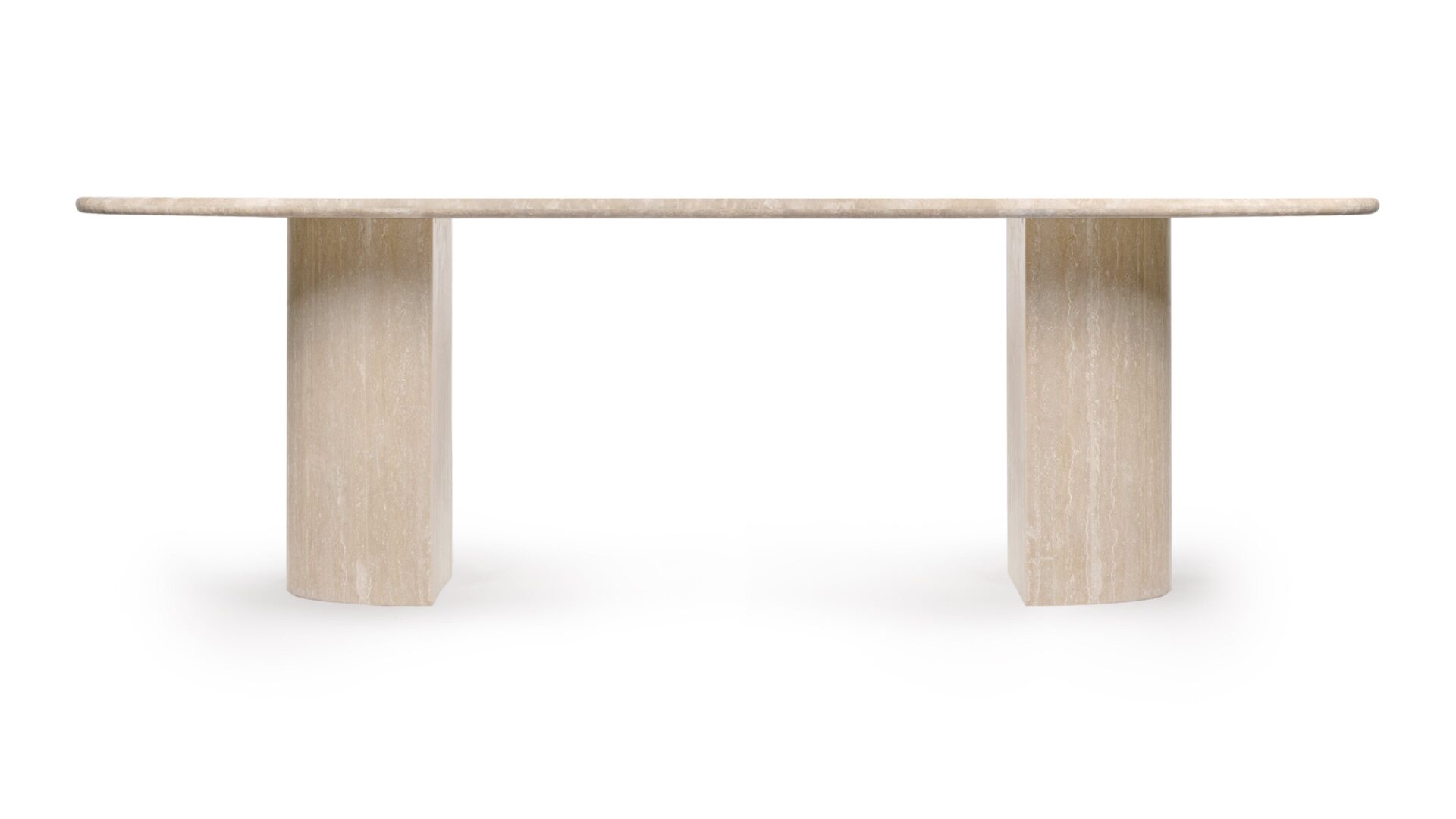 Experience the ultimate in fine dining with the Dante travertine dining table, perfect for large or open-plan dining spaces. Combining visual appeal with durability, this table's minimalist design enhances the luxurious Italian travertine. Crafted with a honed finish to resist stains, scratches, and marks, this travertine table offers both glamour and practicality for everyday use. Its impressive 98” top is supported by two demi-lune column legs, inspired by classical architecture with a modern twist.