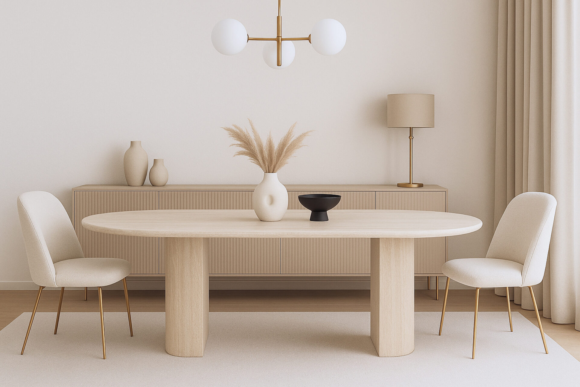Experience a contemporary twist on the pedestal base table with the Dante dining table. Boasting two demi-lune pillar legs and a spacious 98” oval table top, this design effortlessly accommodates extra place settings, ideal for avid hosts.