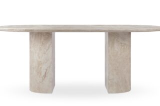 Adorned in exquisite travertine throughout, the Dante dining table makes a stunning statement. A modern interpretation of the traditional double pedestal table, this opulent piece is crafted to enhance upscale, contemporary interiors.