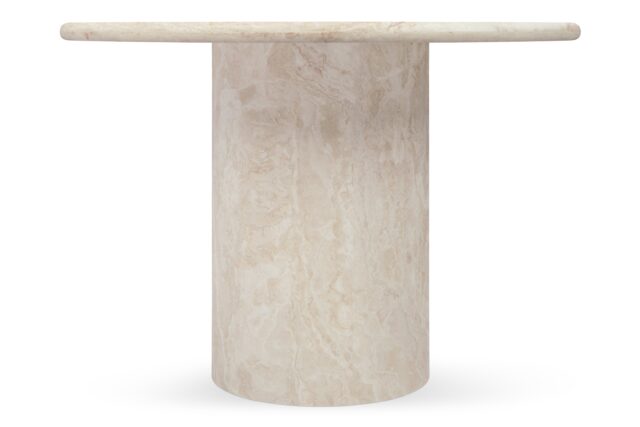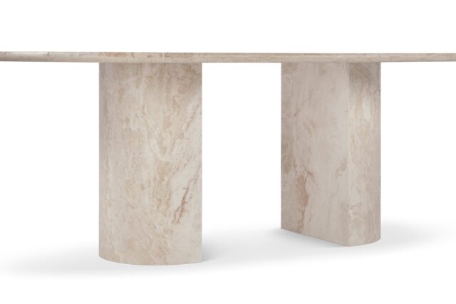 Elevate your dining space with the stunning Dante dining table, a perfect focal point that embodies the essence of fine dining. With its sleek and unpretentious design, this table beautifully complements and enhances the opulent Italian travertine. Featuring a refined polished finish, the Dante dining table is a striking centerpiece for elegant dining and entertaining. Its generous 77” top is gracefully supported by two demi-lune column legs, inspired by classical architecture yet delivered with a modern flair.