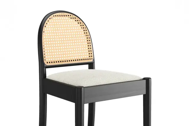 Black wood offers timeless structure and visual depth, while white bouclé adds inviting softness with its tactile, cloud-like texture. The woven rattan introduces breathability and natural warmth, creating a balanced mix of durability, comfort, and contrast that feels refined yet organic.