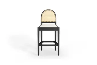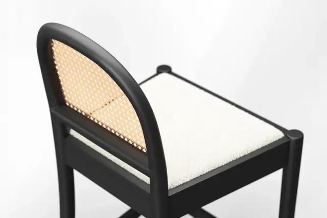The Yuna Bar Chair in black and white makes a striking yet refined impression. Its bold frame contrasts with the soft bouclé seat, while the woven rattan backrest adds texture and warmth. Perfect for modern kitchens or home bars, it blends mid-century charm with contemporary comfort—turning casual seating into an elegant moment of connection and ease. -