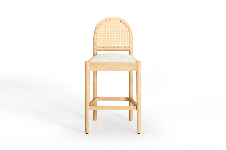 Crafted in oak wood tones for a natural, uplifting look, this bar-height Yuna Chair pairs a plush white bouclé seat with a woven rattan backrest. The result is airy, inviting, and effortlessly elegant.