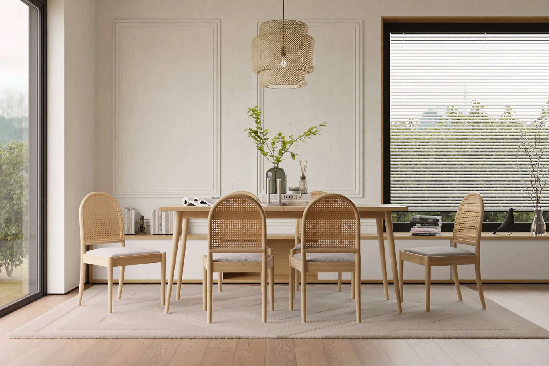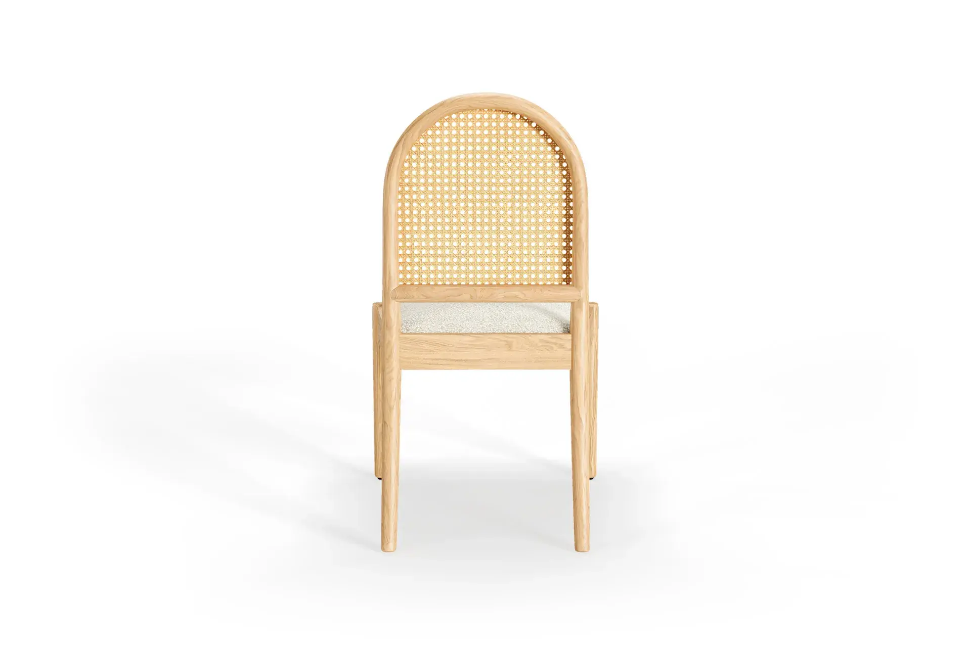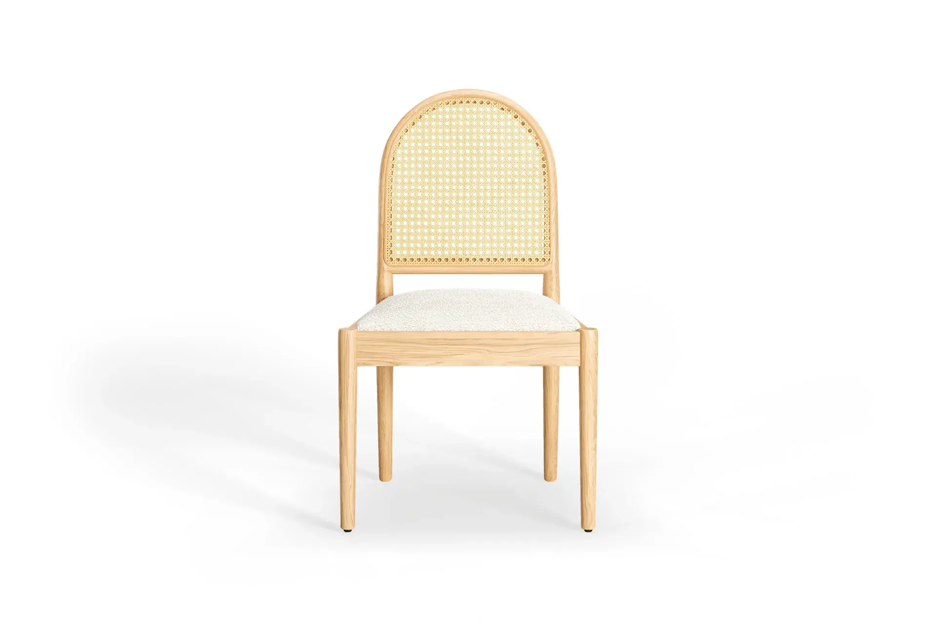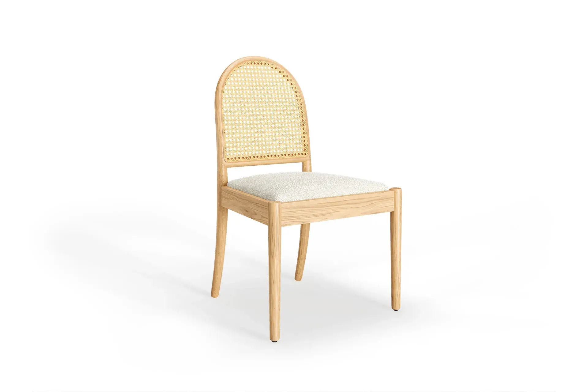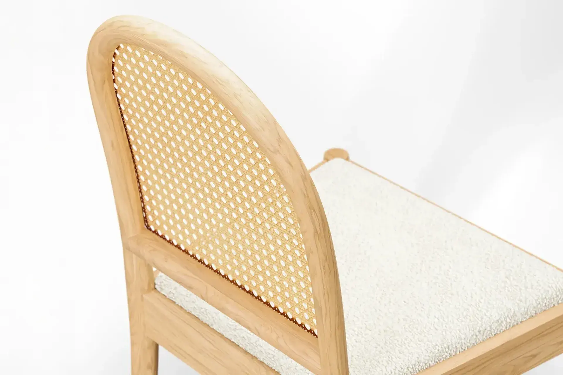 Light-toned wood brings brightness and a sense of openness, celebrating the natural grain’s calm beauty. White bouclé enhances the experience with cozy texture and lasting resilience, while woven rattan adds gentle ventilation and artisanal character — a blend that feels fresh, soothing, and enduring.