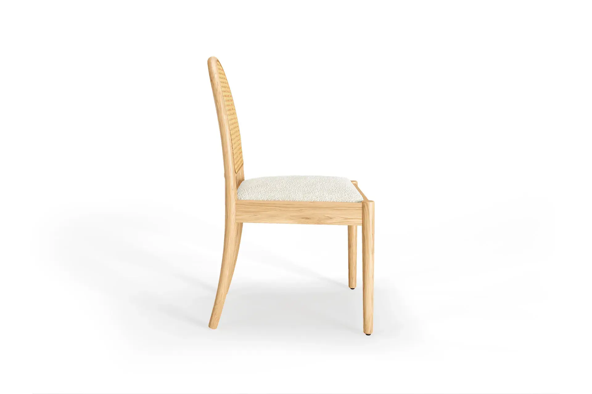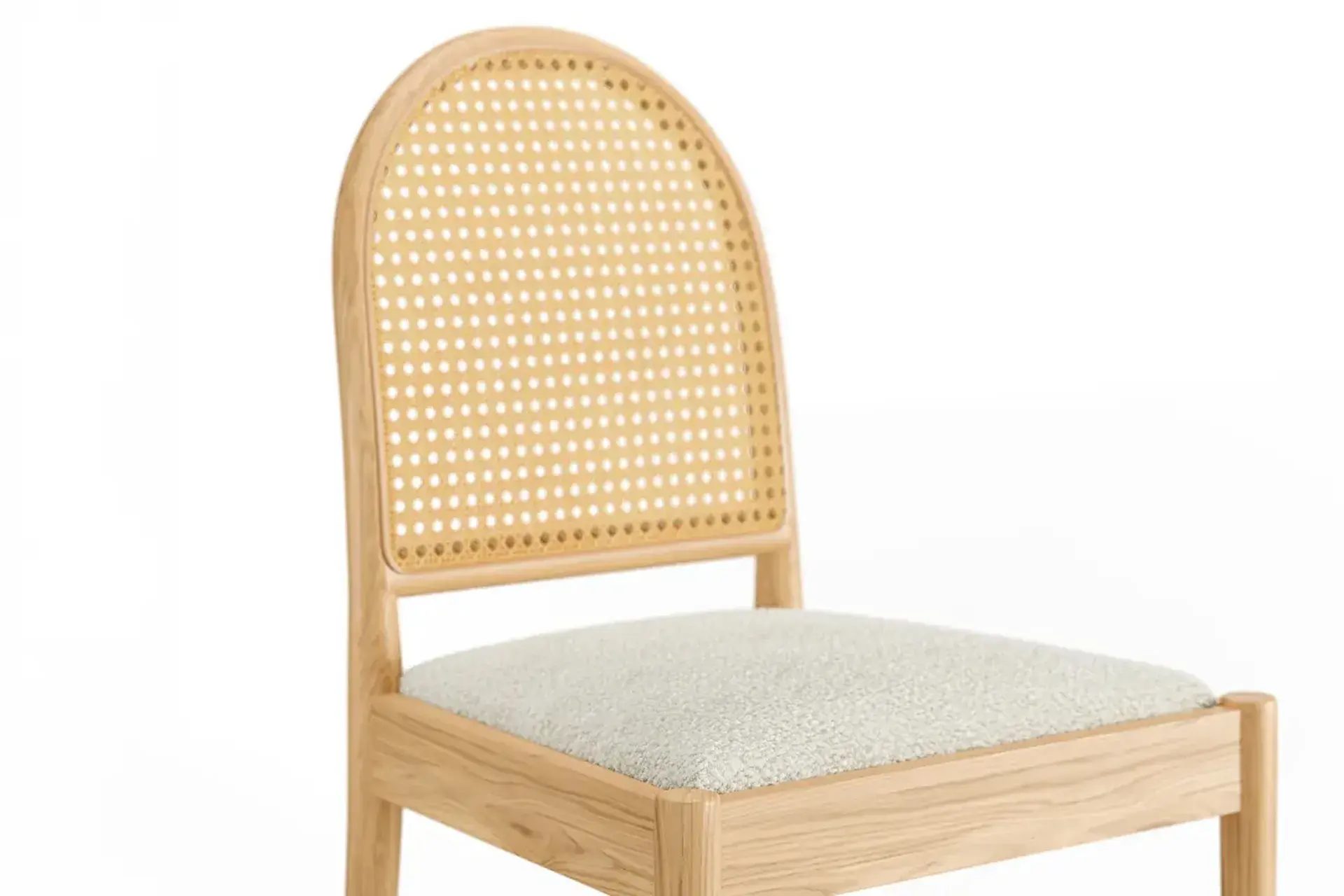 The Yuna Dining Chair in oak wood and white bouclé radiates calm, natural charm. Its curved lines and airy tones create a soft, inviting presence, while the rattan backrest and bouclé seat provide texture and comfort. Ideal for minimalist interiors, it blends Scandinavian simplicity with timeless warmth and elegance. -
